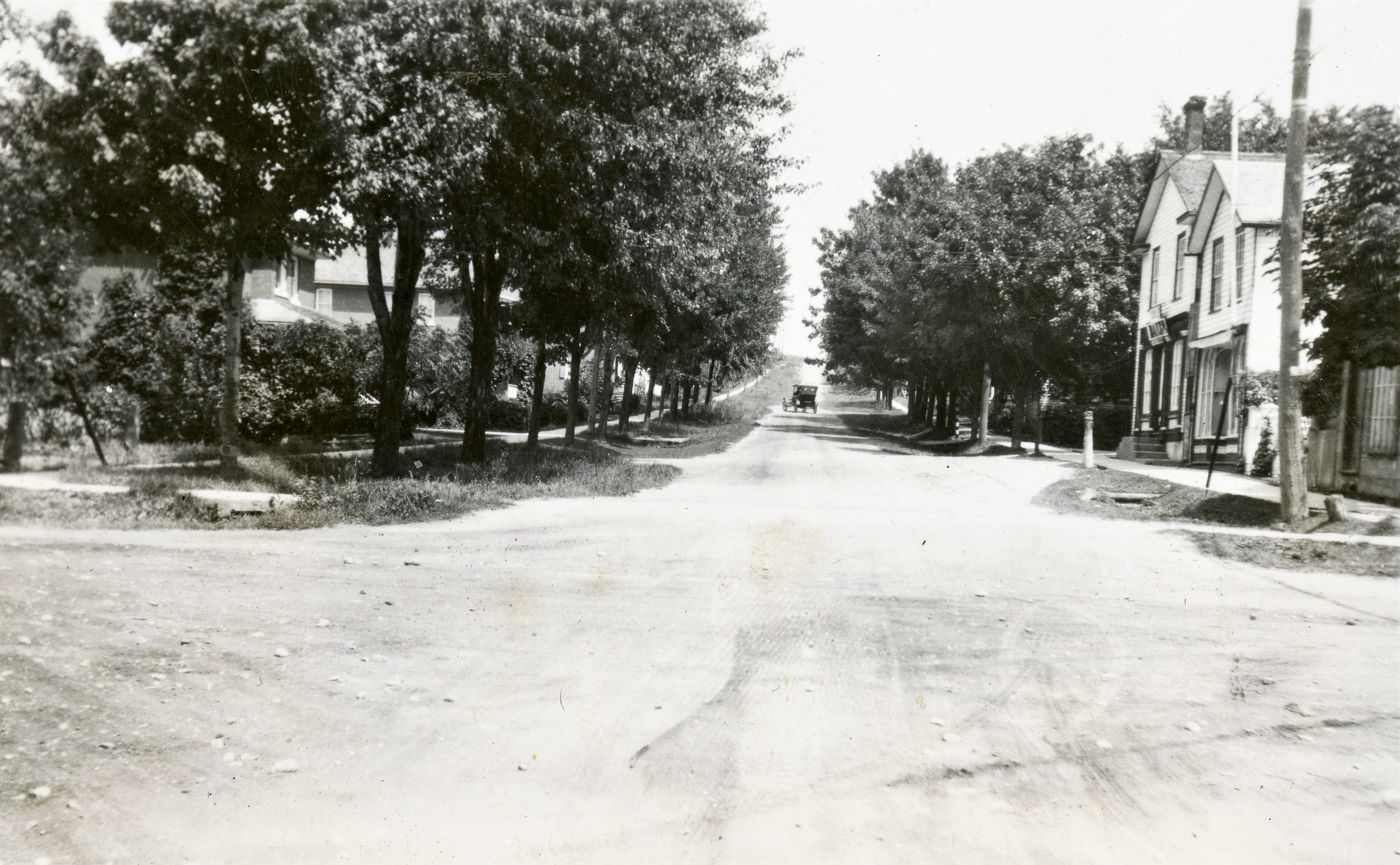 Street scene with trees of King Street, looking east from the four corners intersection.