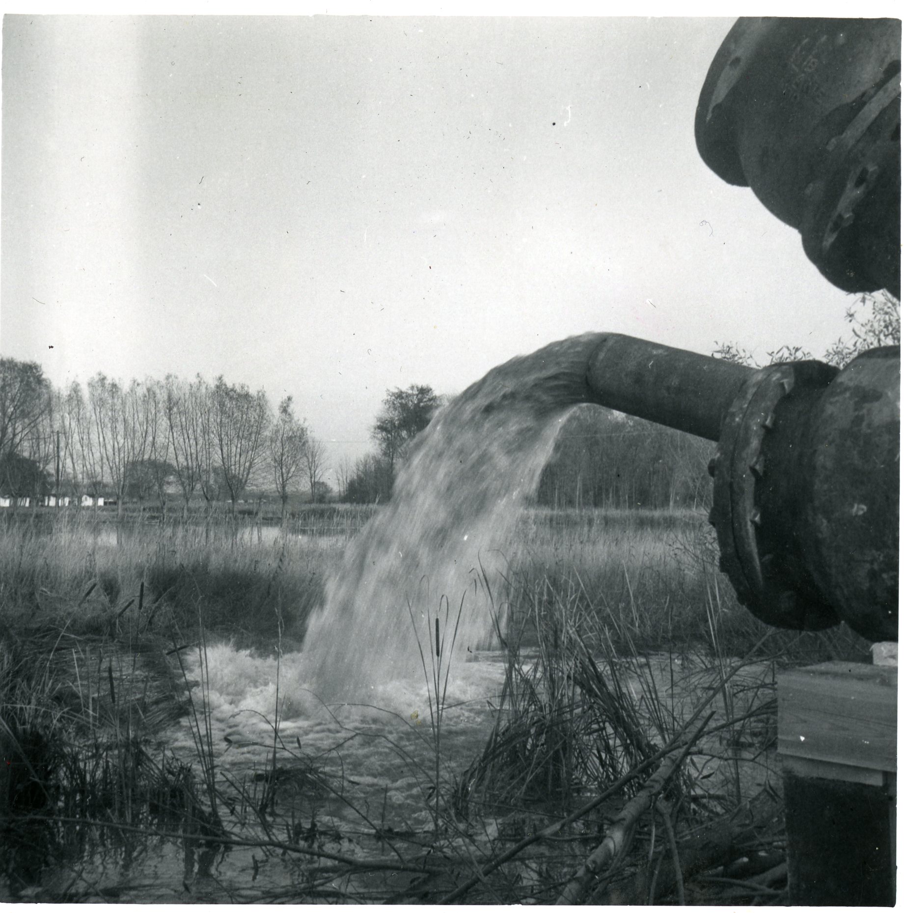 Photo of water gushing out of a large pipe in Holland Marsh following Hurricane Hazel.