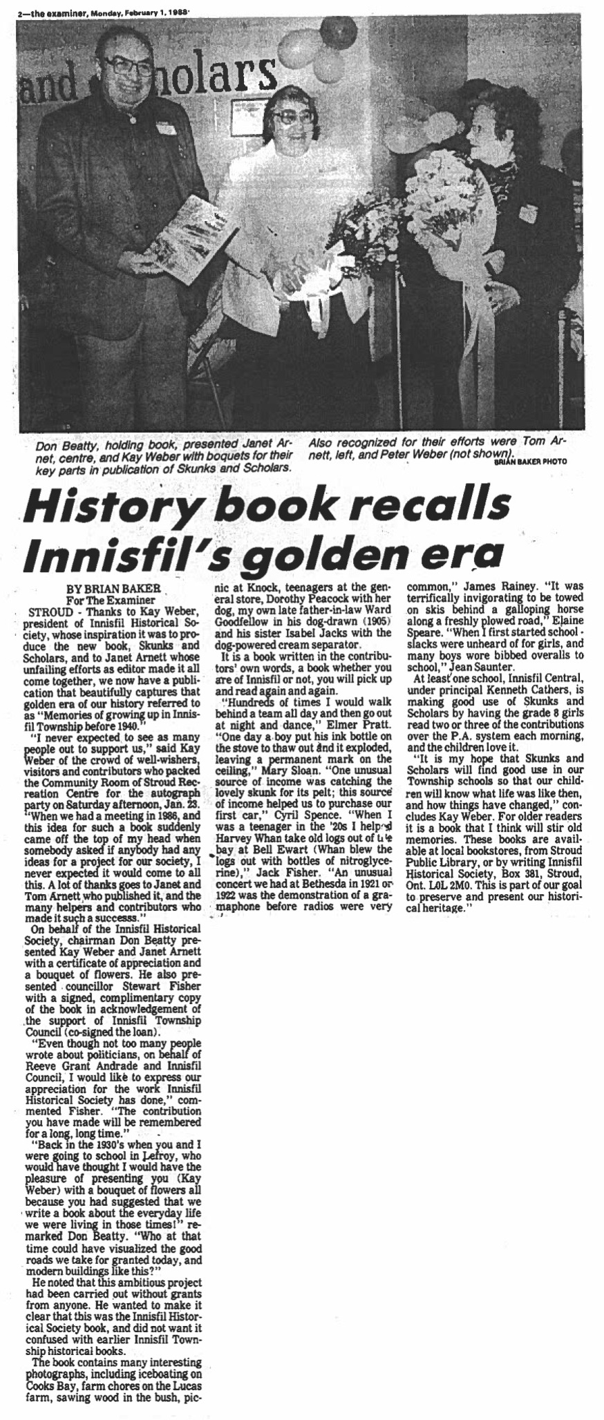 Newspaper article written by Brian Baker, for The Examiner, with an accompanying image. The aritcle discusses the release of book 'Skunks and Scholar' - which is a collection of memories of growing up in Innisfil Township before 1940. The caption with the accompanying image reads: "Don Beatty, holding book, presented Janet Arnet, centre, and Kay Weber with boquets for their key parts in publication of Skunks and Scholars. Also recognised or their efforts were Tom Arnett, left, and Peter Weber (not shown)." Poor resolution is due to the acquisition being a photocopy, if you have an original copy of this document please contact the library.