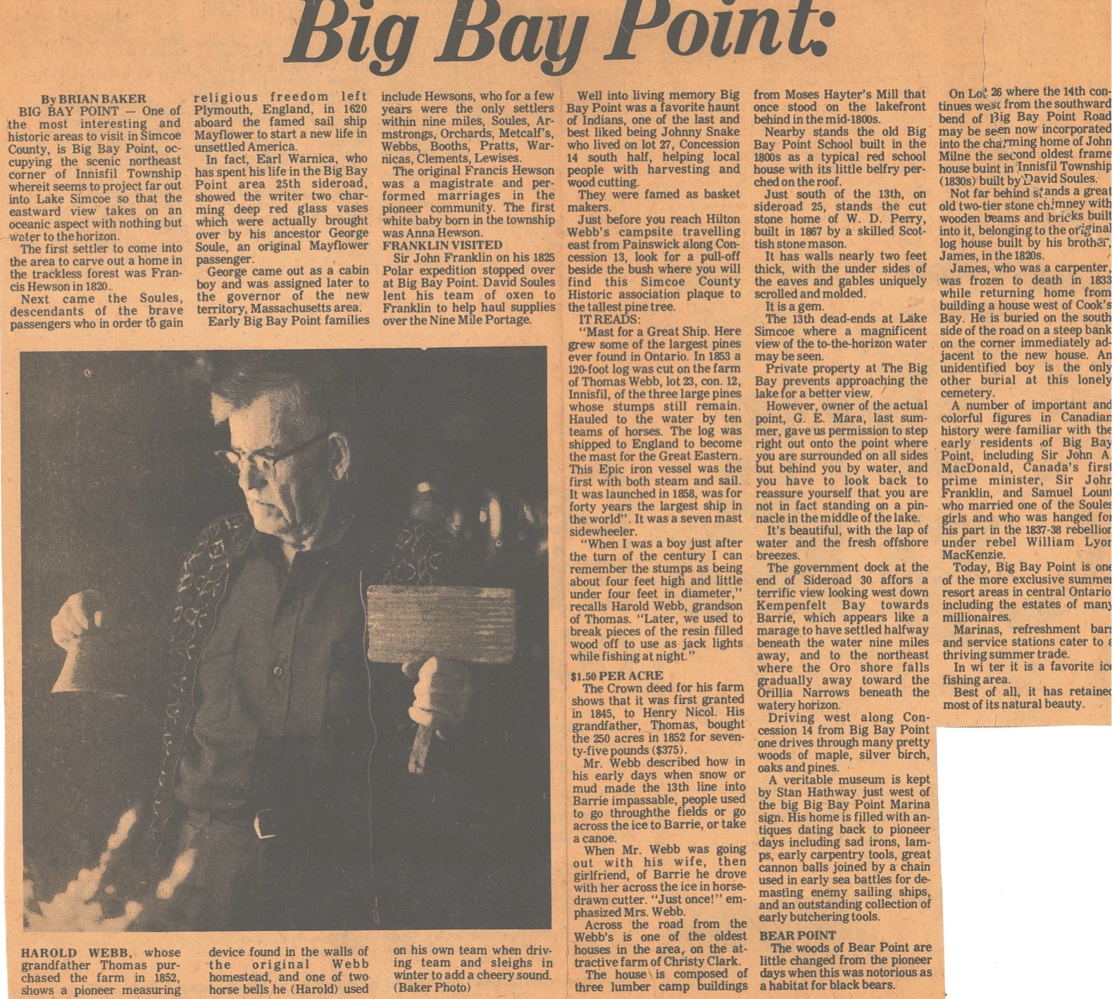 Newspaper article written by Brian Baker, discussing Big Bay point as one of the most interesting historc areas to visit in Simcoe County. The image attached to the article has a caption below, which reads "Harold Webb, whose grandfather Thomas purchased the farm in 1852, shows a pioneer measuring device found in the walls of the original Webb headstead, and one of two horse bells he (Harold) used on his own team when driving team and sleighs in the winter to add a cheery sound."