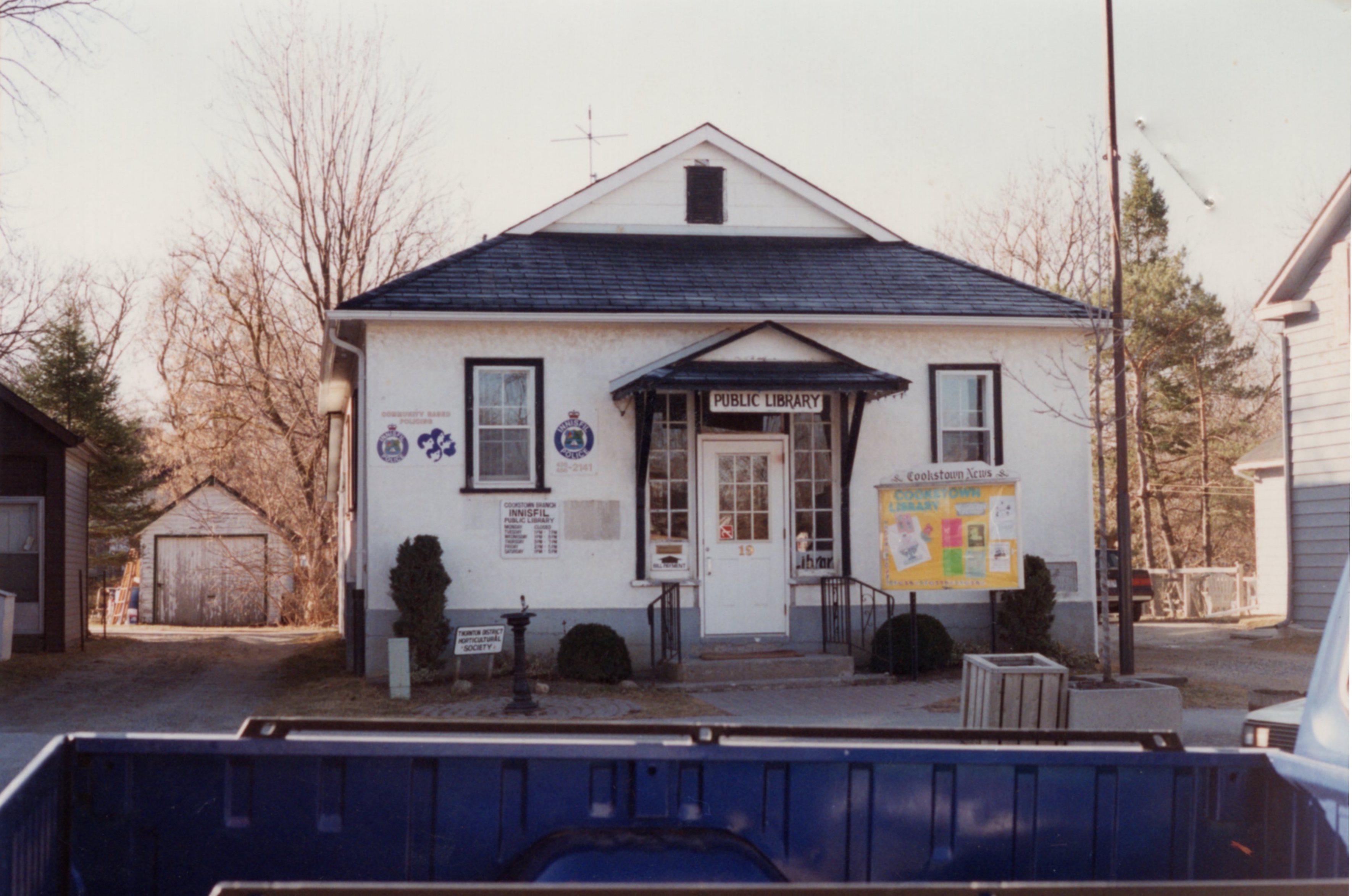 Coloured photograph of the original building for Cookstown Public Library. The building is painted white, with golden address numbers, 19, on the front door. The community board out side has a sign saying "Cookstown news", and is filled with a colourful display of information.