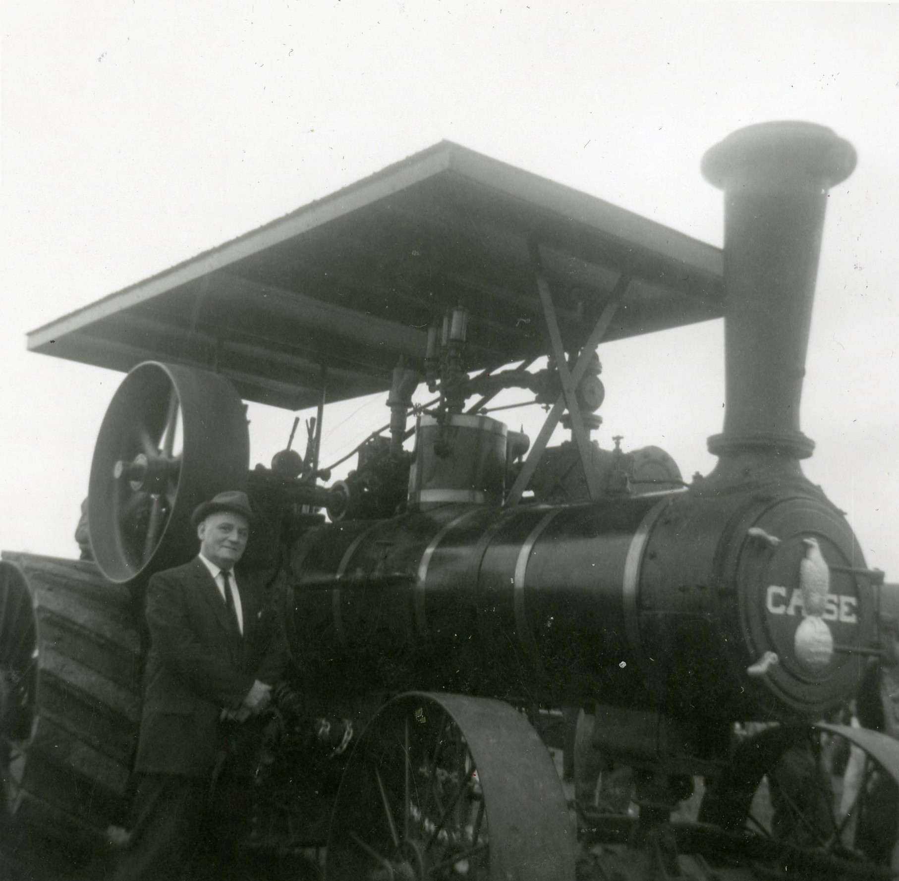 Photo of Mel Marling dressed in a suit and hat standing in front of a large steam engine.