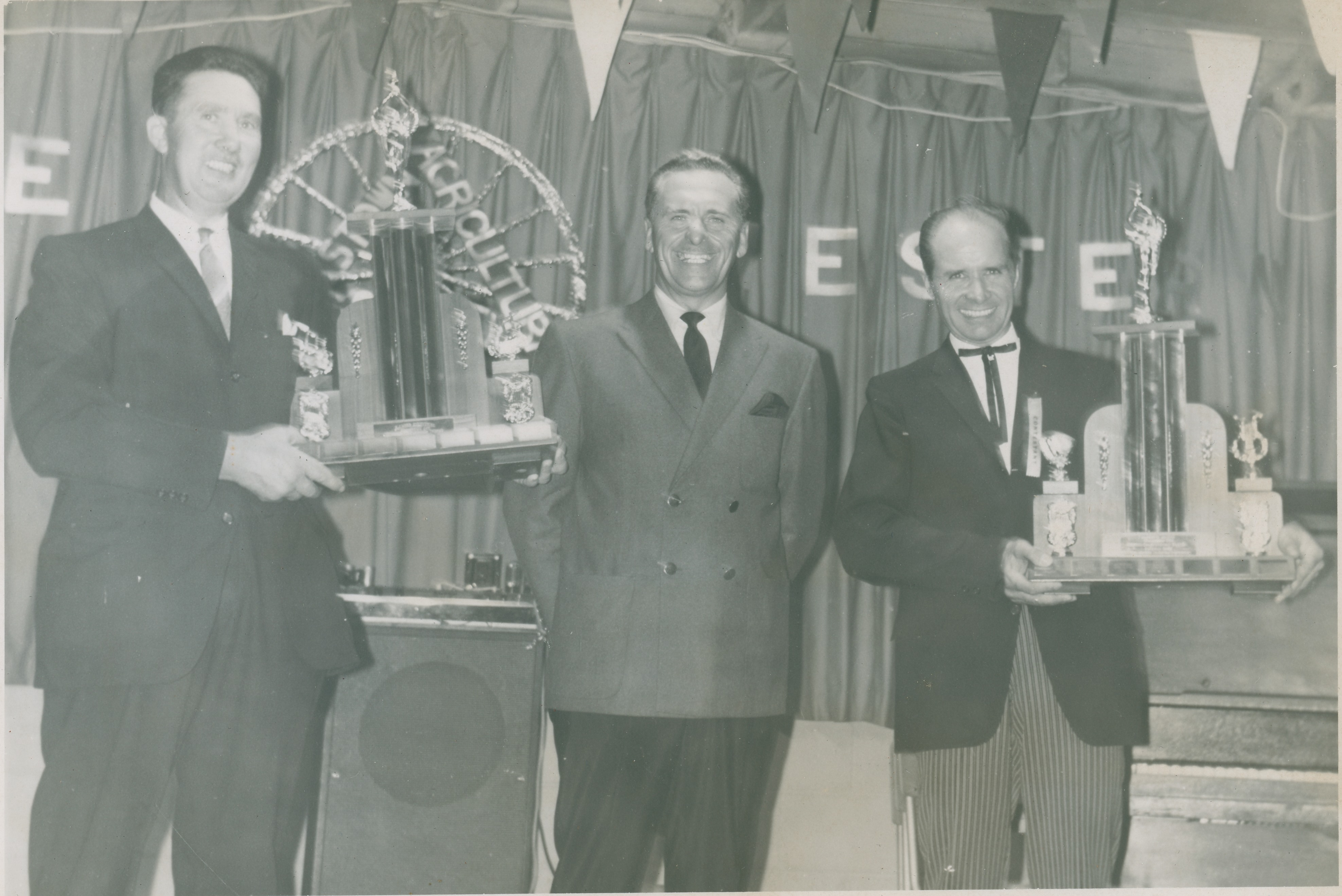 Group of men on stage; men holding trophies, left Mr. Burnett, Gordon Tapp in centre.