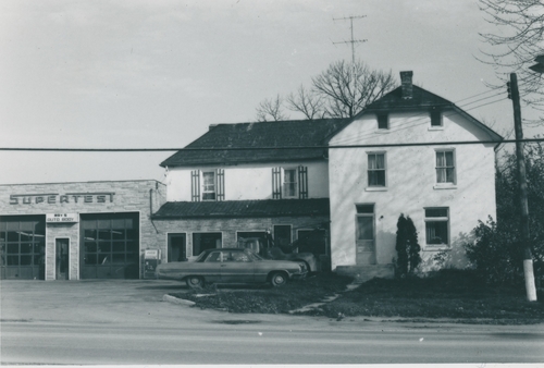 Two-storey stucco house with side extension and closed-in side porch; Supertest garage next door