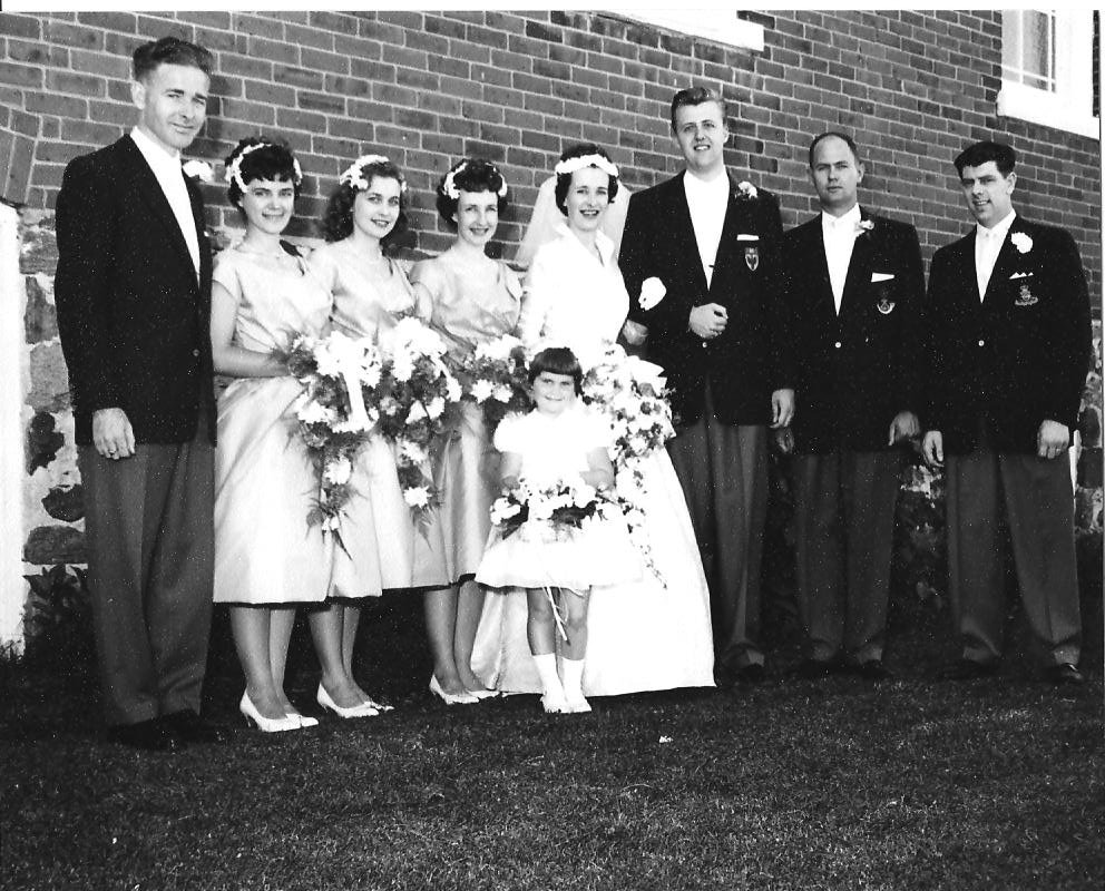 Group photo of Sheila Reive and Bradley Frid on the day of their wedding, 25 June 1960 at Lefroy United Church. Pictured from left to right are: Gord Burns, Barbara Purvis, Margret Wice, Jennifer Svenson, Sheila Reive, Bradley Frid, George Frid, and Jim McNeil. The flower girl standing in front of Sheila was named Kelly. This photo was donated to the Innisfil Historical Society by Janice Mason.