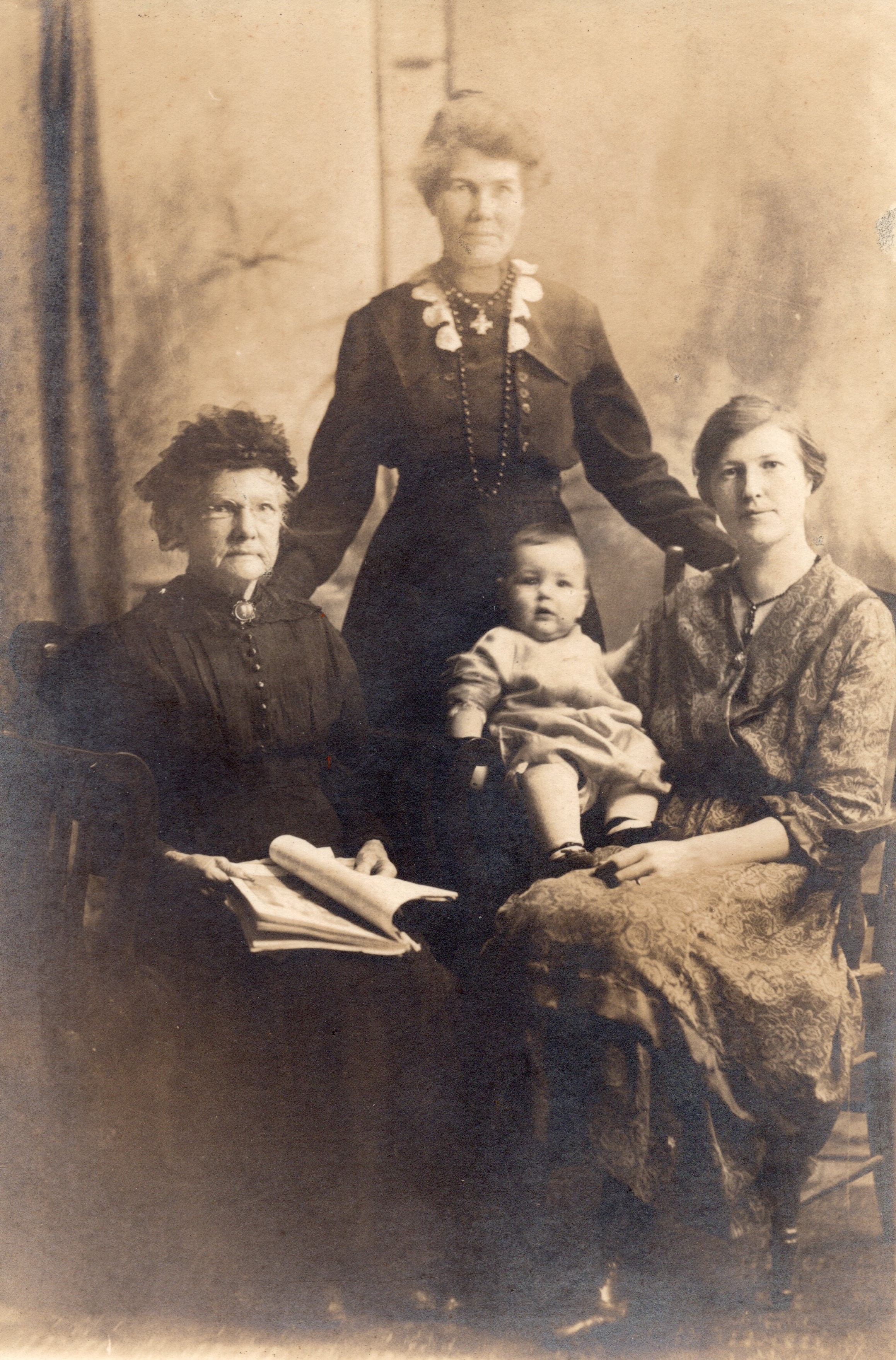 Studio portrait of three women with a baby boy. They are identified as Grandmother Webb (left), Aunt Ellen Brown (centre), Sadie Carr (right), and the baby is Burton Carr. The photo was taken by Martin Studio in Barrie, Ontario.
