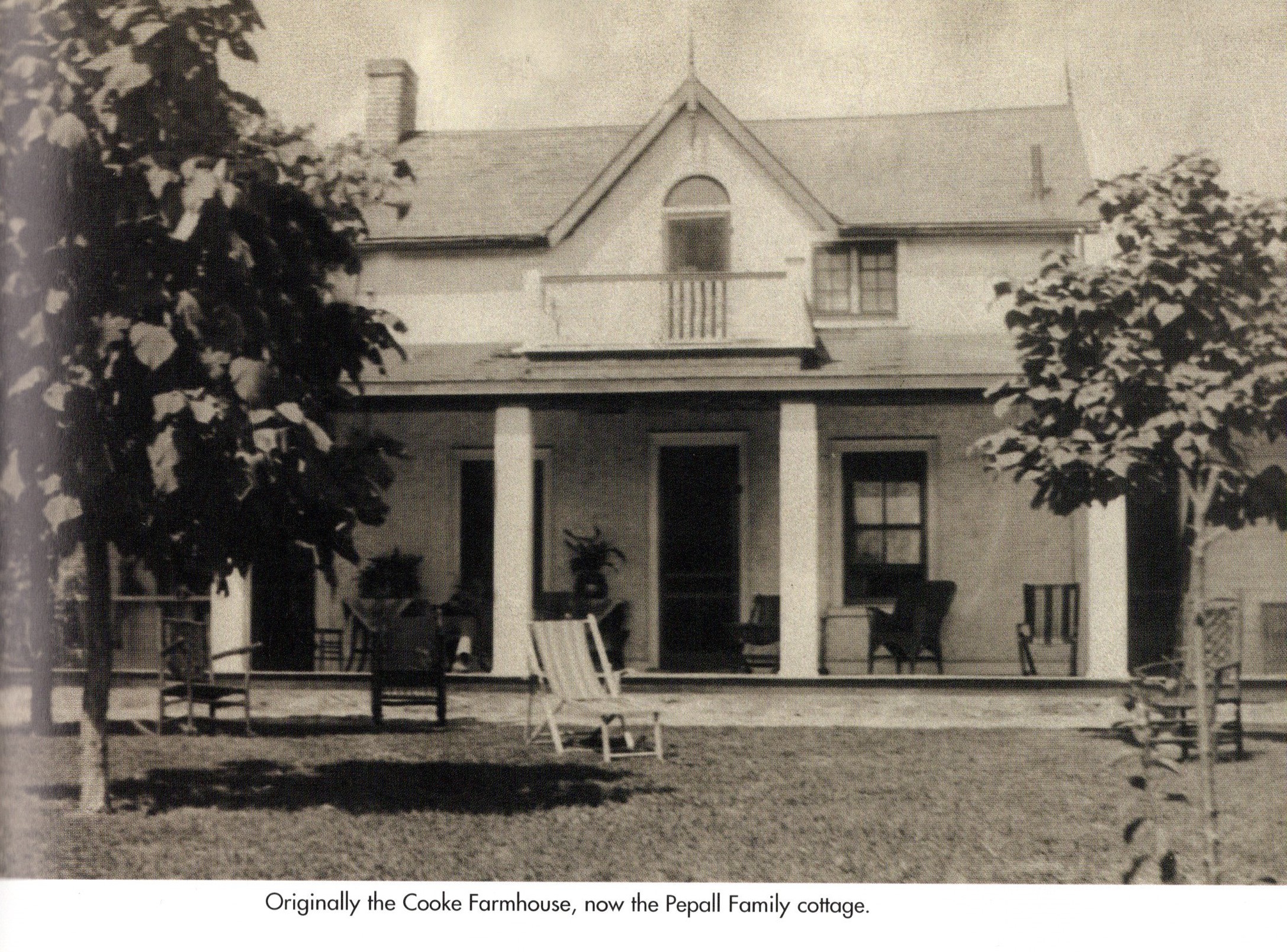 Photo depicting the front exterior of the Pepall family cottage in Big Bay Point, formerly the home of the Cooke family. James Baron Cooke and his family had moved from Barrie to Innisfil in approximately 1877 and settled on a farm at Big Bay Point on lot 30, concession 14. The farm today exists as the Big Bay Point golf course as well as a strip of waterfront that had been converted into cottage waterfront lots. The stucco exterior now hides the original logs used in building the home. Photo donated to Bill Warnica by Nanci Patten, the second great-granddaughter of James Baron Cooke and his wife Mary Alice Booth.