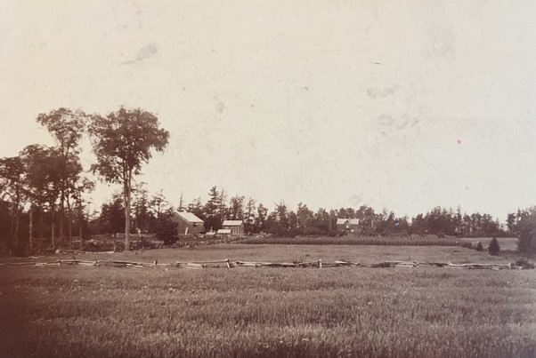 Undated photo of the farm of James Baron Cooke. A house, barn, and another outbuilding are visible in the centre of the photo, as well as a zig-zag split-rail fence in the foreground. James Baron Cooke and his family had moved from Barrie to Innisfil in approximately 1877 and settled on a farm at Big Bay Point on lot 30, concession 14. The farm today exists as the Big Bay Point golf course as well as a strip of waterfront that was converted into cottage waterfront lots. Photo donated to Bill Warnica by Nanci Patten, the second great-granddaughter of James Baron Cooke and his wife Mary Alice Booth.