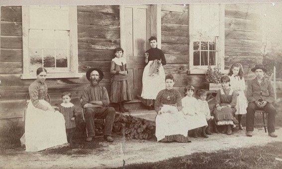 Undated photo from the late 1800s depicting some of the thirteen children of James Baron Cooke and Mary Alice Booth. The family are gathered at the front entrance of their log home, with two windows flanking either side of the front door. The home still exists today as the Pepall Family cottage, though the stucco exterior hides the logs. James Baron Cooke and his family had moved from Barrie to Innisfil in approximately 1877 and settled on a farm at Big Bay Point on lot 30, concession 14. The farm today exists as the Big Bay Point golf course as well as a strip of waterfront that had been converted into cottage waterfront lots. Photo donated to Bill Warnica by Nanci Patten, the second great-granddaughter of James Baron Cooke and his wife Mary Alice Booth.