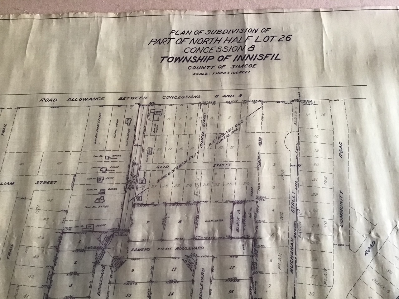 Photograph of the subdivision plan of the north half of lot 26, concession 8, of Innisfil. Included in the plan are: Simcoe Street, Reid Street, Somers Boulevard, and Buchanan Street.