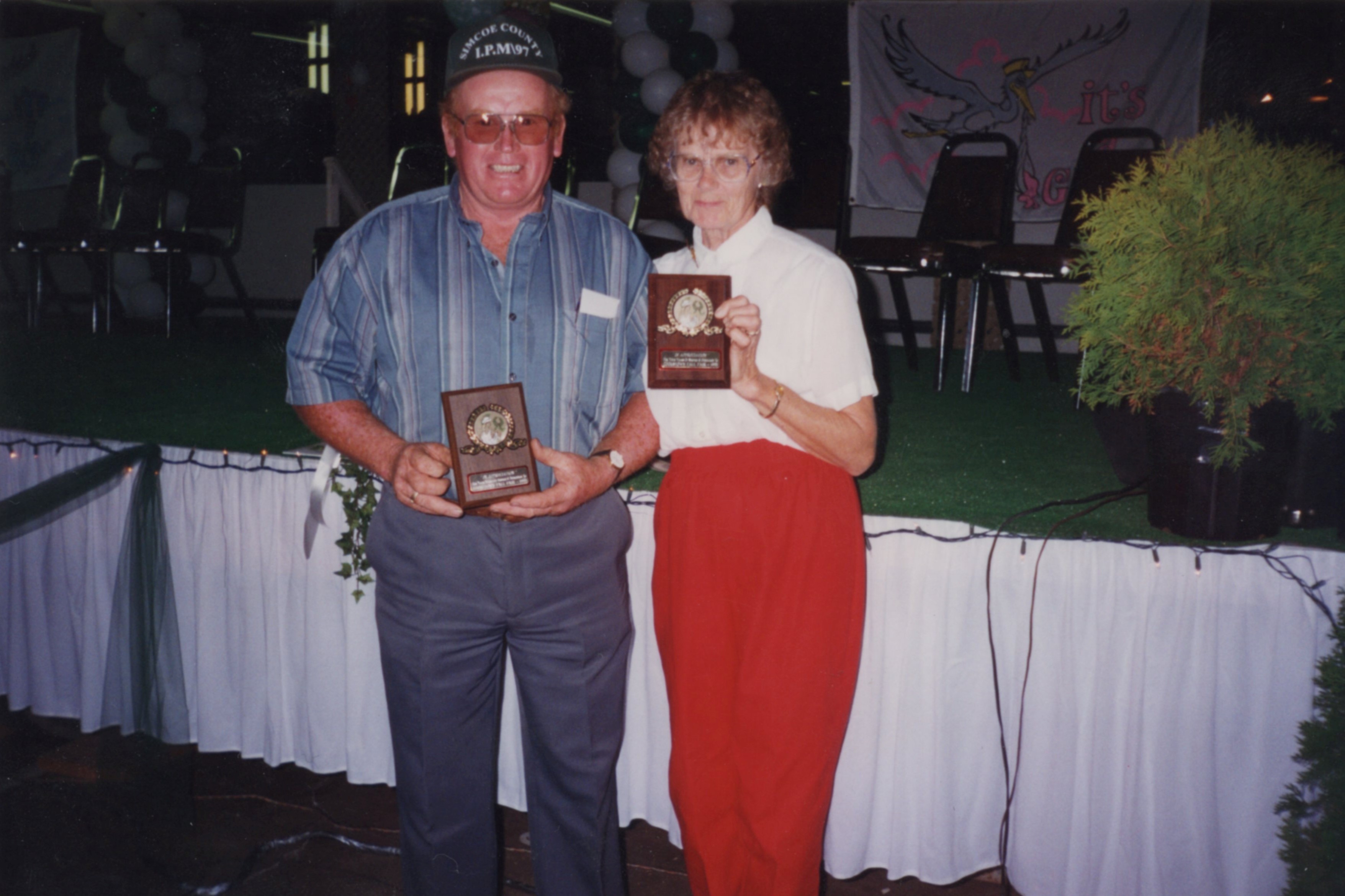 Photo of Keith (left) and Jenn (right) Robinson, both receiving awards for longtime service to the board. They are standing in front of a stage, likely where they were presented these awards. Keith is wearing a blue striped shirt, orange glasses, and a baseball cap that reads "Simcoe County I.P.M\97". Jenn is wearing a white, short-sleeved blouse and a pair of glasses.
