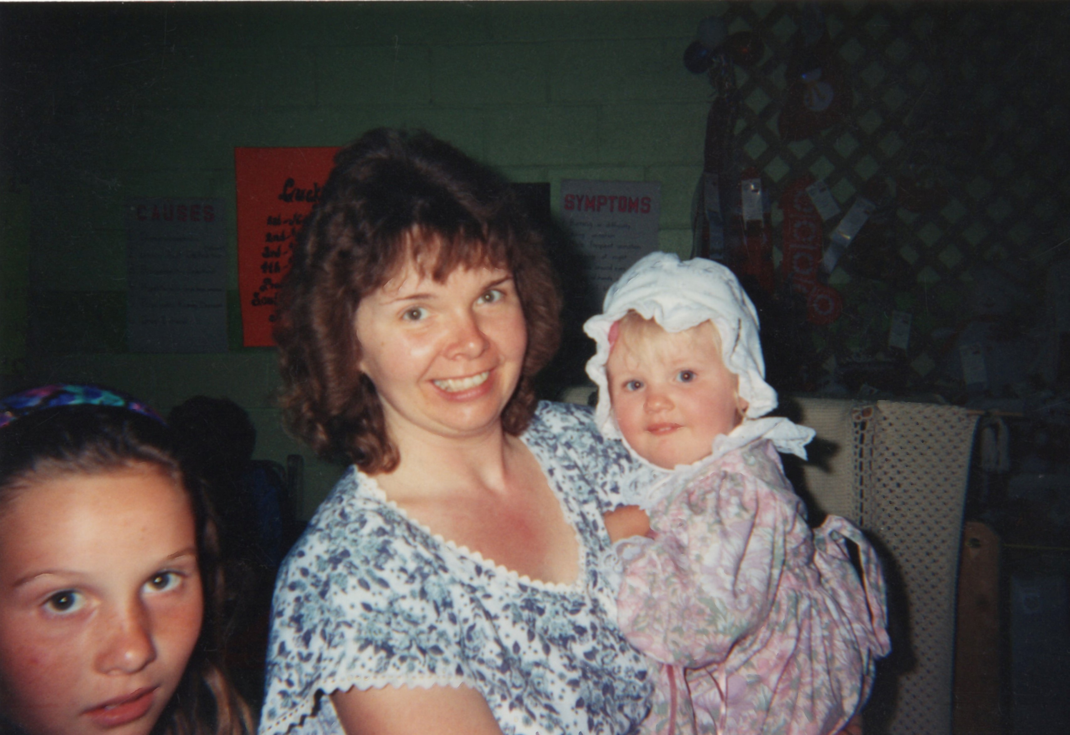Image of Laura Varey wearing a blue and white floral dress, holding a baby that is wearing a white bonnet/hat and a pink and green floral dress, white white lace trim. There is an unidentified girl present in the bottom left corner of the photograph. Laura Varey and accompanying baby are likely contestants in the 1992 Baby Contest at Cookstown Agricultural Fair.