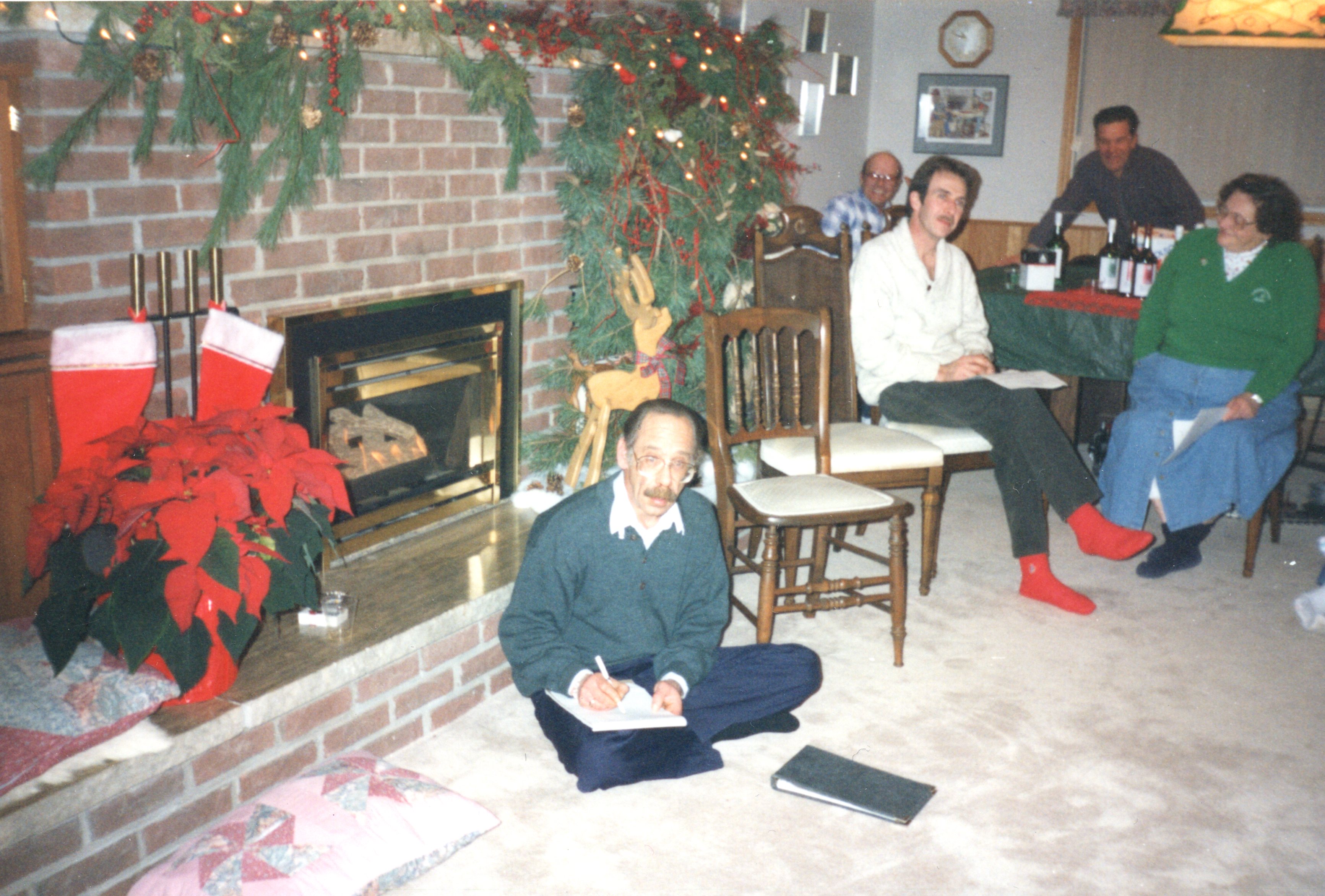 Members of the Cookstown Agricultural Society at their annual Christmas party in 1997. One member of the party can be seen seated with a notepad and pen, while four others are seated around a table. On the floor is Wreford "Wref" Nix, with Mike Elines seated on a chair wearing red socks, and Jennie Man seated in a chair next to him wearing a green sweater and denim skirt.
