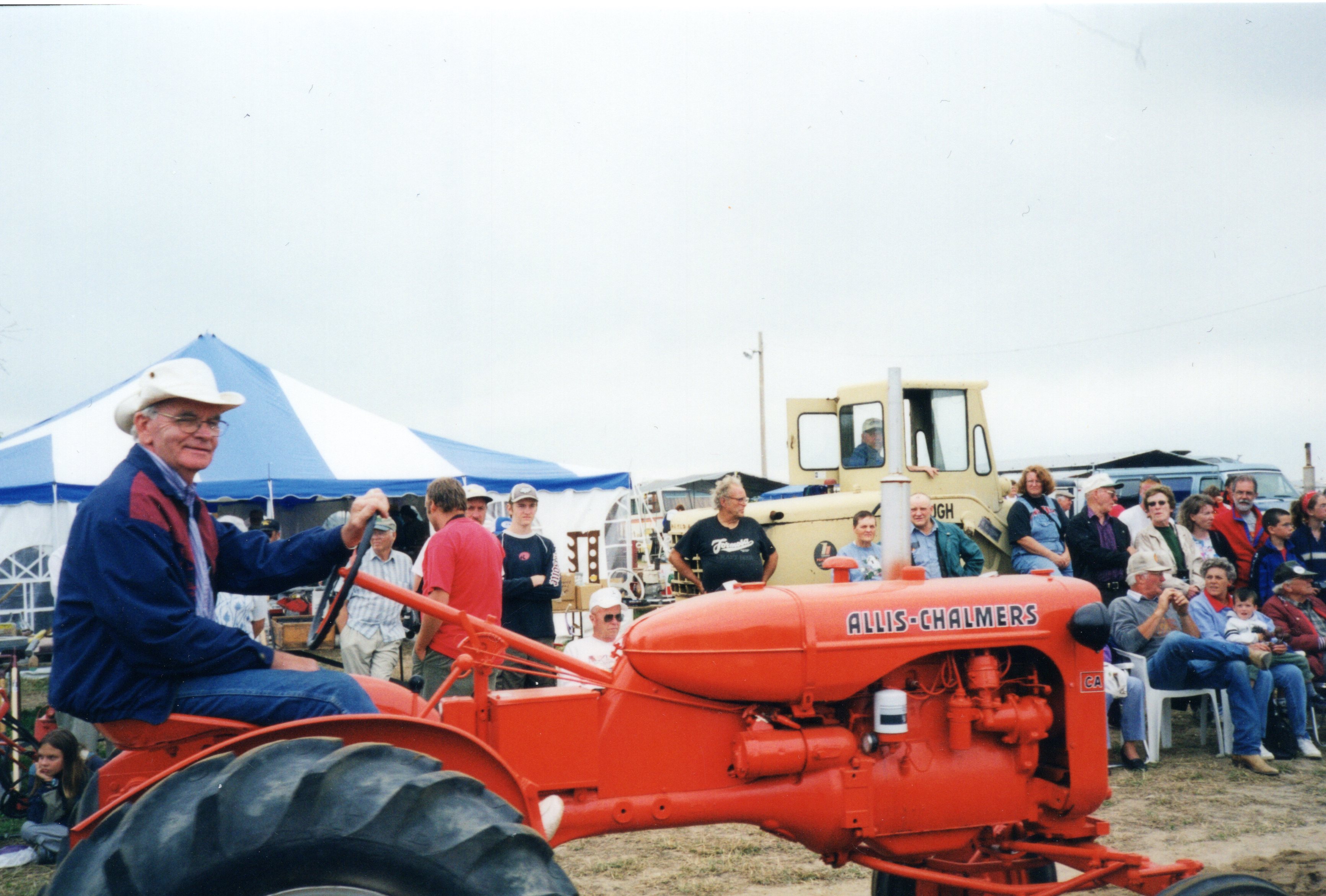 Image of a tractor driving along a sandy path, in front of an audience at the Agricultural Fall Fair at the Cookstown Fairgrounds. The tractor is a bright red model Allis-Chalmers with black lights, wheels, and steering wheel. The man driving the tractor is wearing a white cowboy hat, a pair of eye-glasses, and blue jacket.