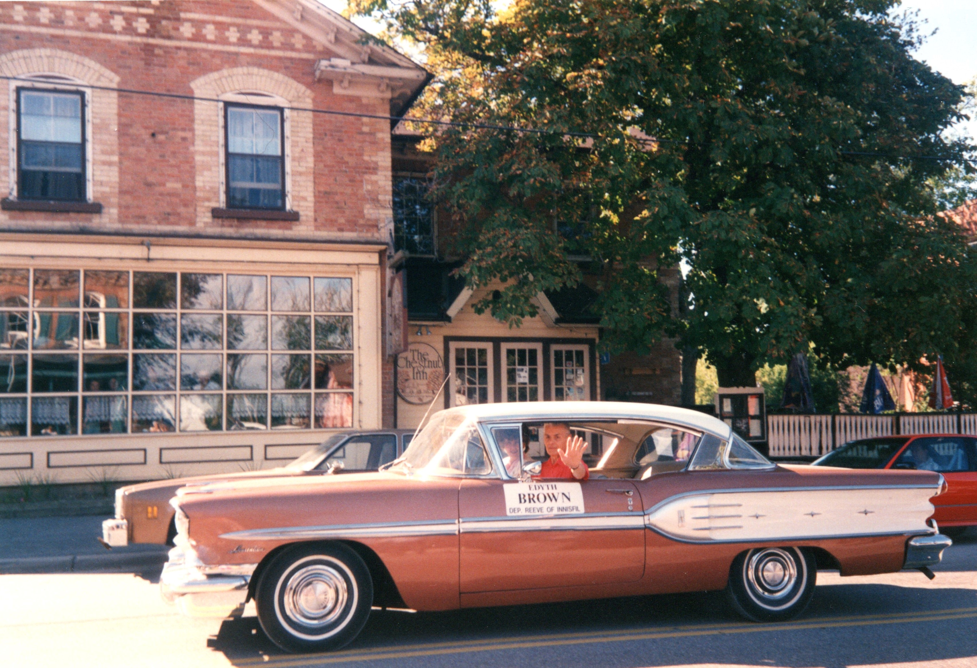 Image of a brown and white vintage car, with a sign that reads "Edyth Brown Dep. Reeve of Innisfil". In the driver's seat is Geoff Dawney in a red t-shirt, waving at the camera with Edyth Brown in the passenger's seat. The car was part of a parade down Queen Street in Cookstown.