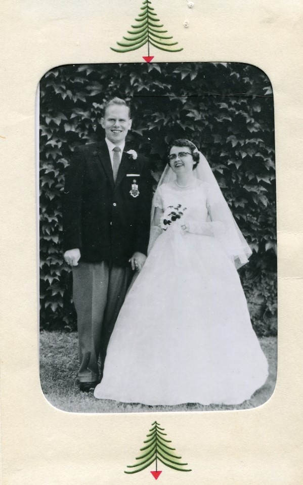 Wedding portrait of John and Lorraine Martin, no date provided. John is wearing a dark suit jacket and grey pants, and Lorraine is dressed in a white wedding gown and veil holding a bouquet. The photo seems to be a part of a Christmas card depicting a minimalist Christmas tree design above and below the photo.