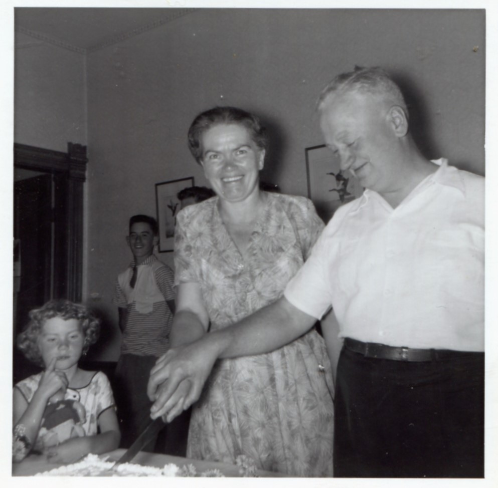Black and white photo taken in September 1955 of Dalton and Mildred Guest (née Irwin) on the occasion of their 25th Wedding Anniversary. They are pictured simultaneously cutting a cake while an unidentified little girl watches.