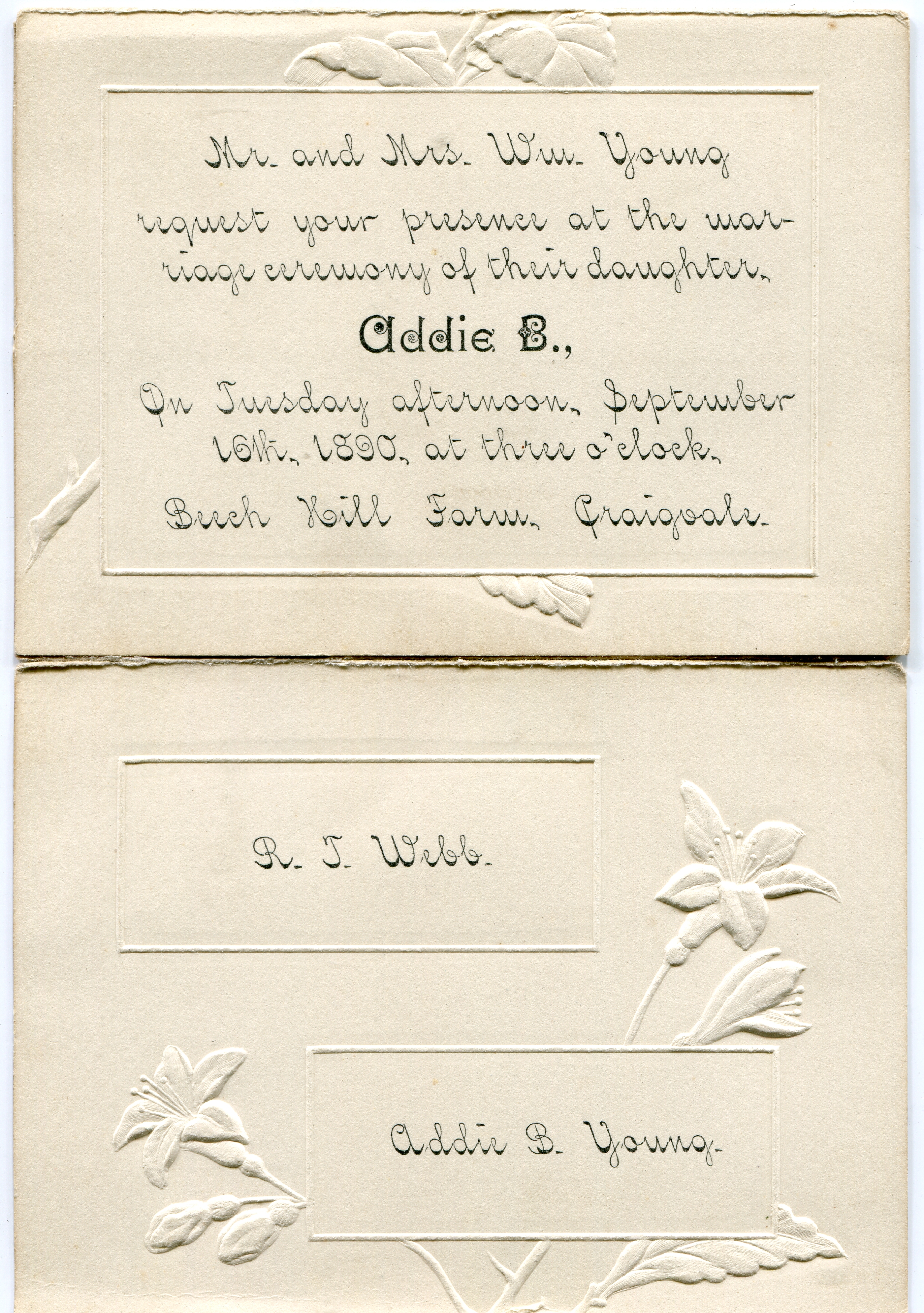 Invitation to the wedding of Ada "Addie" Young (sister of George Young Sr.) to Robert T. Webb, scheduled for Tuesday 16 September 1890. The invitation reads: "Mr. and Mrs. Wm. [William] Young request your presence at the marriage ceremony of their daughter Addie B., on Tuesday afternoon, September 16th, 1890, at three o'clock Buck Hill Farm, Craigvale" with the names "R.T. Webb" and "Addie B. Young" on the lower half of the invitation.