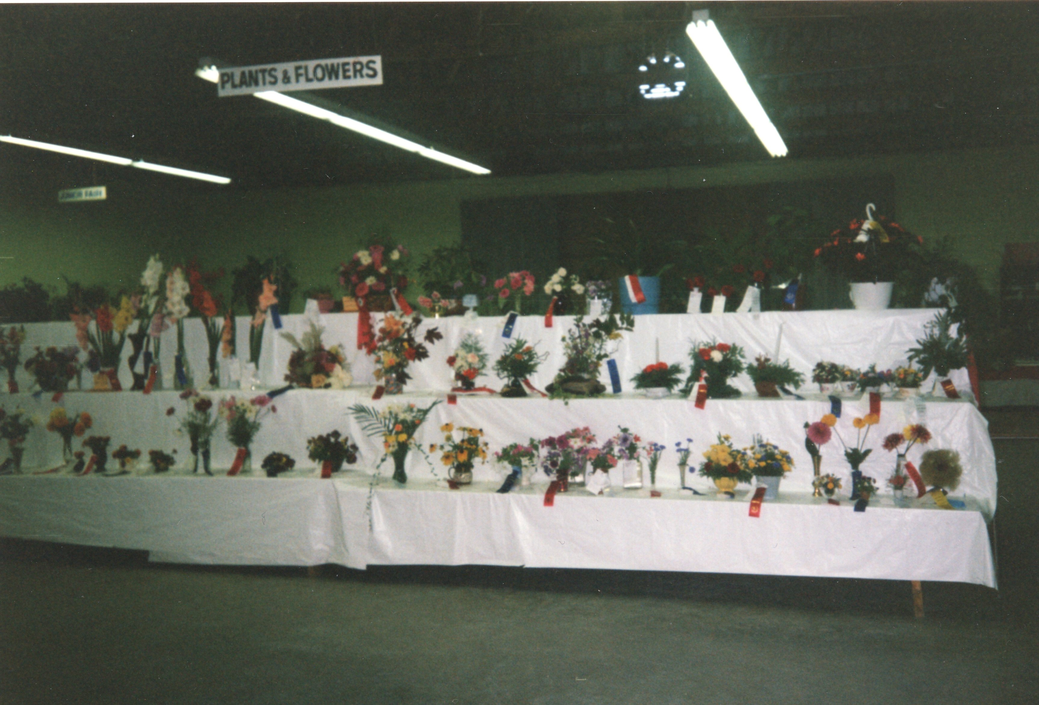 Image of a floral arrangement competition taking place during the agricultural fair in Cookstown. The display area is in three tiers, hosting a variety of different floral arrangements. Blue, red, and white award ribbons are visible.