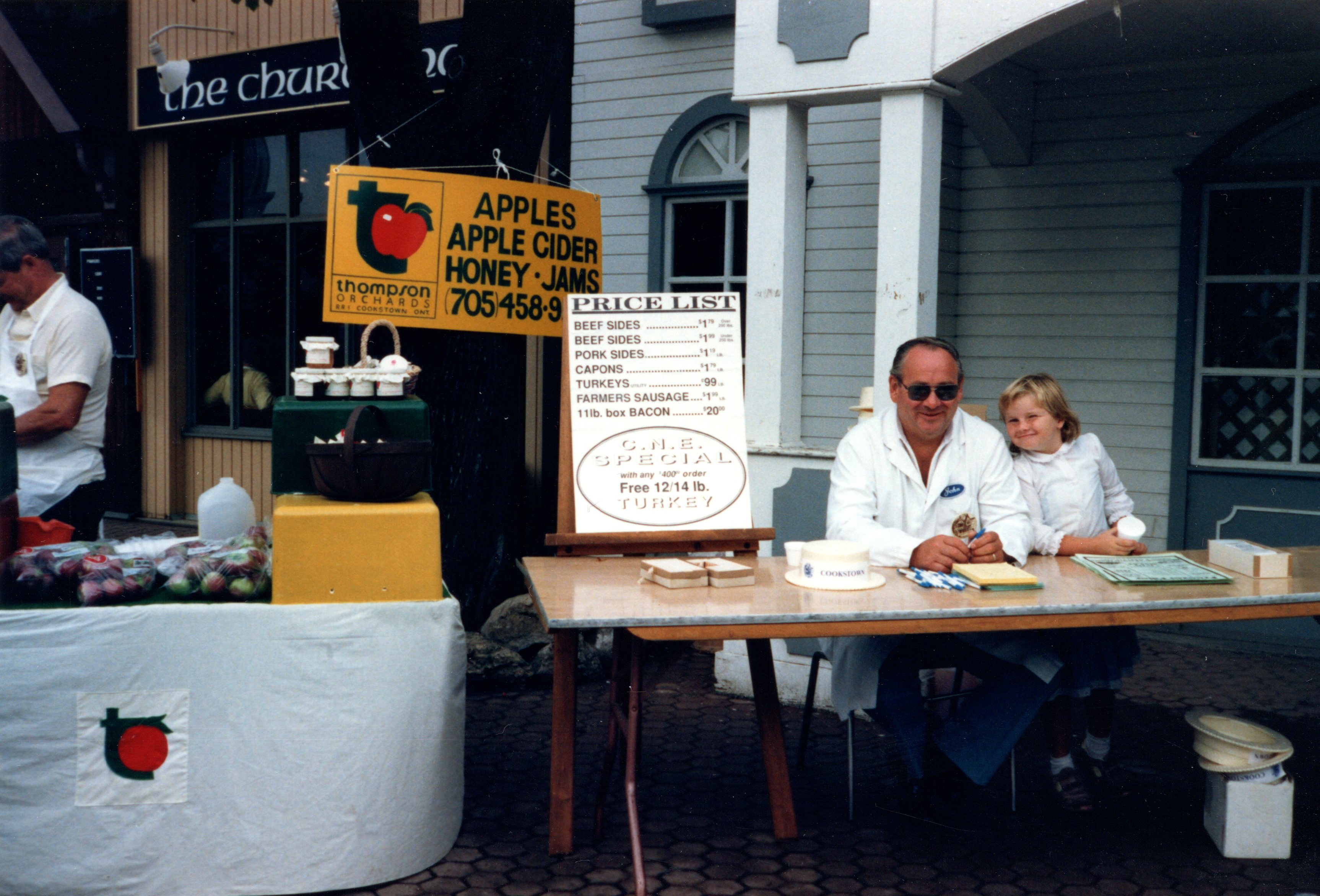 Image of two vendors lining the side of the road during a parade in downtown Cookstown. On the left is a table for Thompson Orchards of Cookstown selling apples, apple cider, honey, and jams. On the right is an unnamed table selling beef sides for $1.79 for over 250 pounds or $1.99 for under 250 pounds, pork sides for $1.19 a pound, capons for $1.79 a pound, utility turkeys for $0.99 a pound, farmers sausage for $1.99 a pound, and 11 pound boxes of bacon for $20. The sign also reads "C.N.E. special with any $400 order free 12/14 lb. turkey". A man in a white coat and sunglasses with a nametag that reads "John" sits at the table with a little blonde girl beside him.
