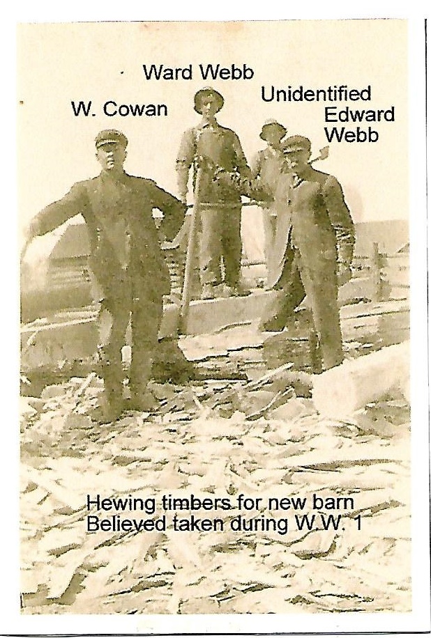 Photo of four men identified from left to right as W. Cowan, Ward Webb, unknown, and Edward Webb hewing timber for a barn, likely during the First World War.