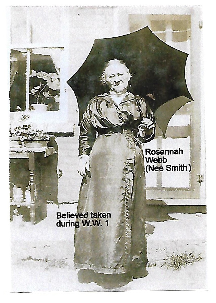 Photo of Rosannah Webb (née Smith) standing outdoors and holding a parasol, believed to have been taken during the First World War.