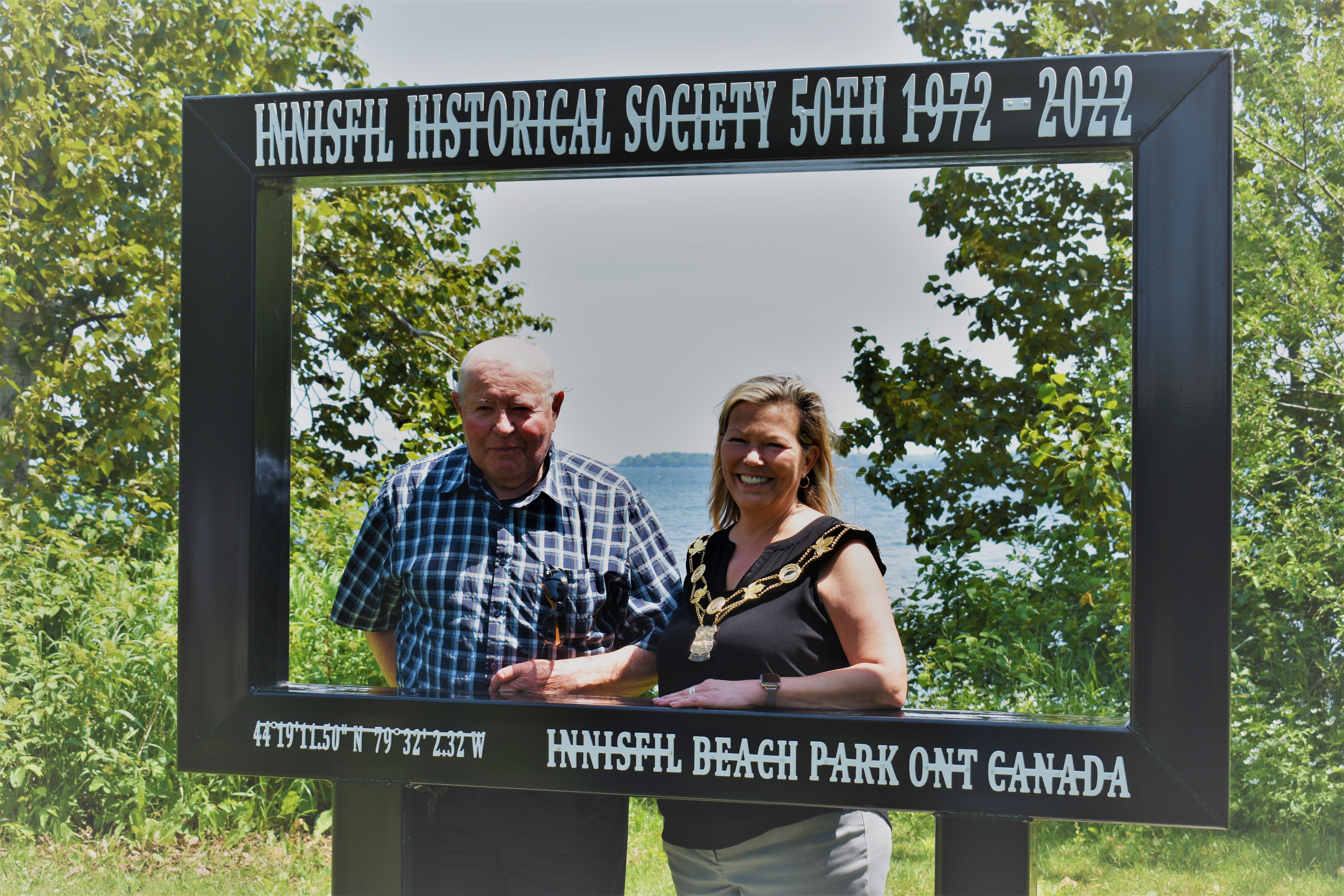 Photo of Bob Givens with Mayor Lynn Dollin standing inside a specially designed life-sized photo frame installed in Innisfil Beach Park to commemorate the 50th anniversary of the Innisfil Historical Society. The frame reads: "Innisfil Historical Society 50th 1972-2022" at the top, and the text at the bottom of "44.19.11.50 N 79.32.2.32 W Innisfil Beach Park Ont Canada" indicates the latitude, longitude, and the location. As described by the Society: "As a permanent reminder of the Innisfil Historical Society’s accomplishments over its 50 years, a stainless-steel picture frame has been installed on a busy shoreline in Innisfil Beach Park, with its backdrop view of Lake Simcoe. We hope that this art project will cause residents and visitors alike to pause and earmark their visit to the park with a family photo." This photo was taken on 17 June 2023 at an event to dedicate the frame and help to celebrate the Society's 50th Anniversary.