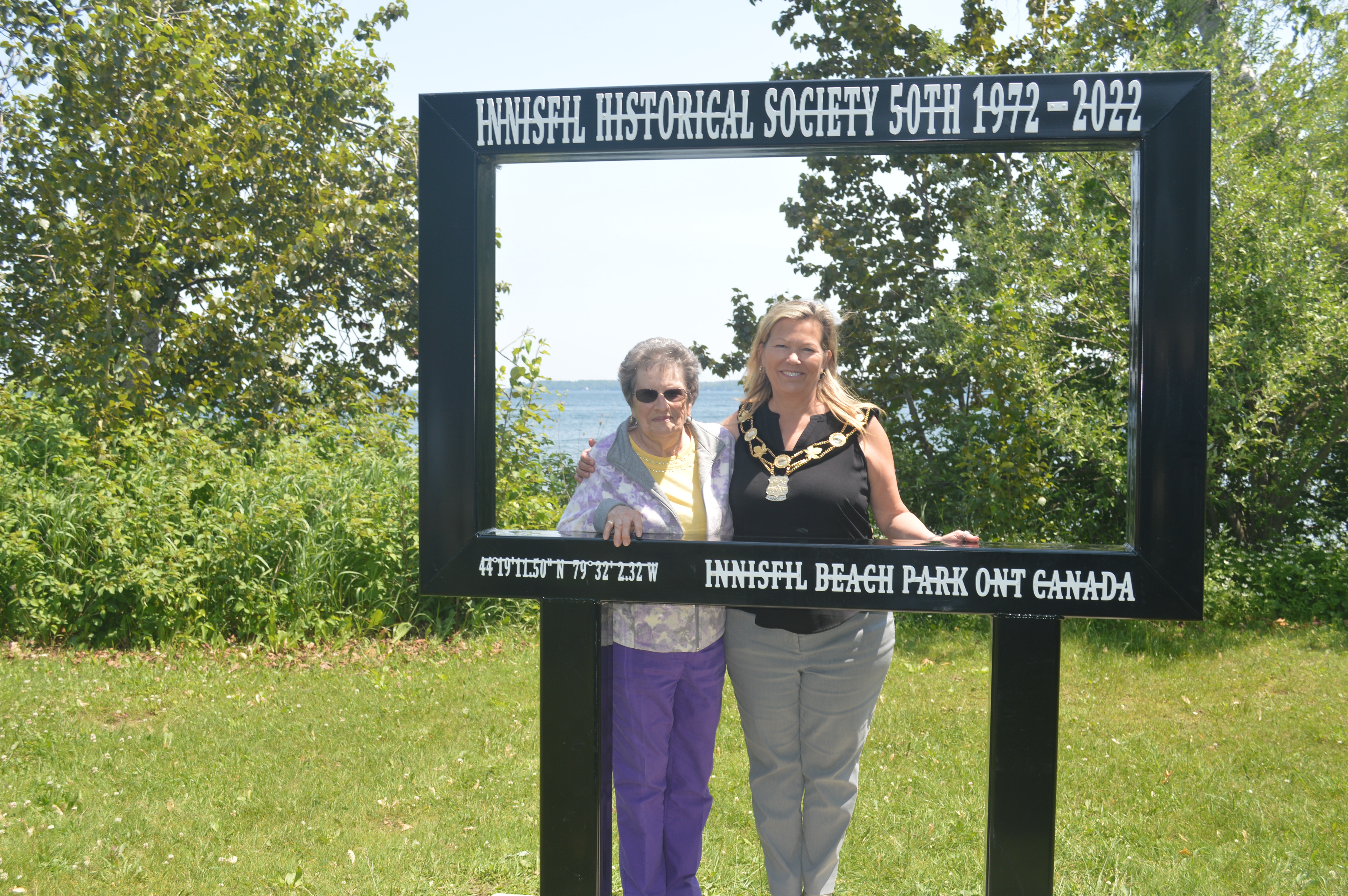 Photo of Barbara Johnston and Mayor Lynn Dollin standing inside a specially designed life-sized photo frame installed in Innisfil Beach Park to commemorate the 50th anniversary of the Innisfil Historical Society. The frame reads: "Innisfil Historical Society 50th 1972-2022" at the top, and the text at the bottom of "44.19.11.50 N 79.32.2.32 W Innisfil Beach Park Ont Canada" indicates the latitude, longitude, and the location. As described by the Society: "As a permanent reminder of the Innisfil Historical Society’s accomplishments over its 50 years, a stainless-steel picture frame has been installed on a busy shoreline in Innisfil Beach Park, with its backdrop view of Lake Simcoe. We hope that this art project will cause residents and visitors alike to pause and earmark their visit to the park with a family photo." This photo was taken on 17 June 2023 at an event to dedicate the frame and help to celebrate the Society's 50th Anniversary.