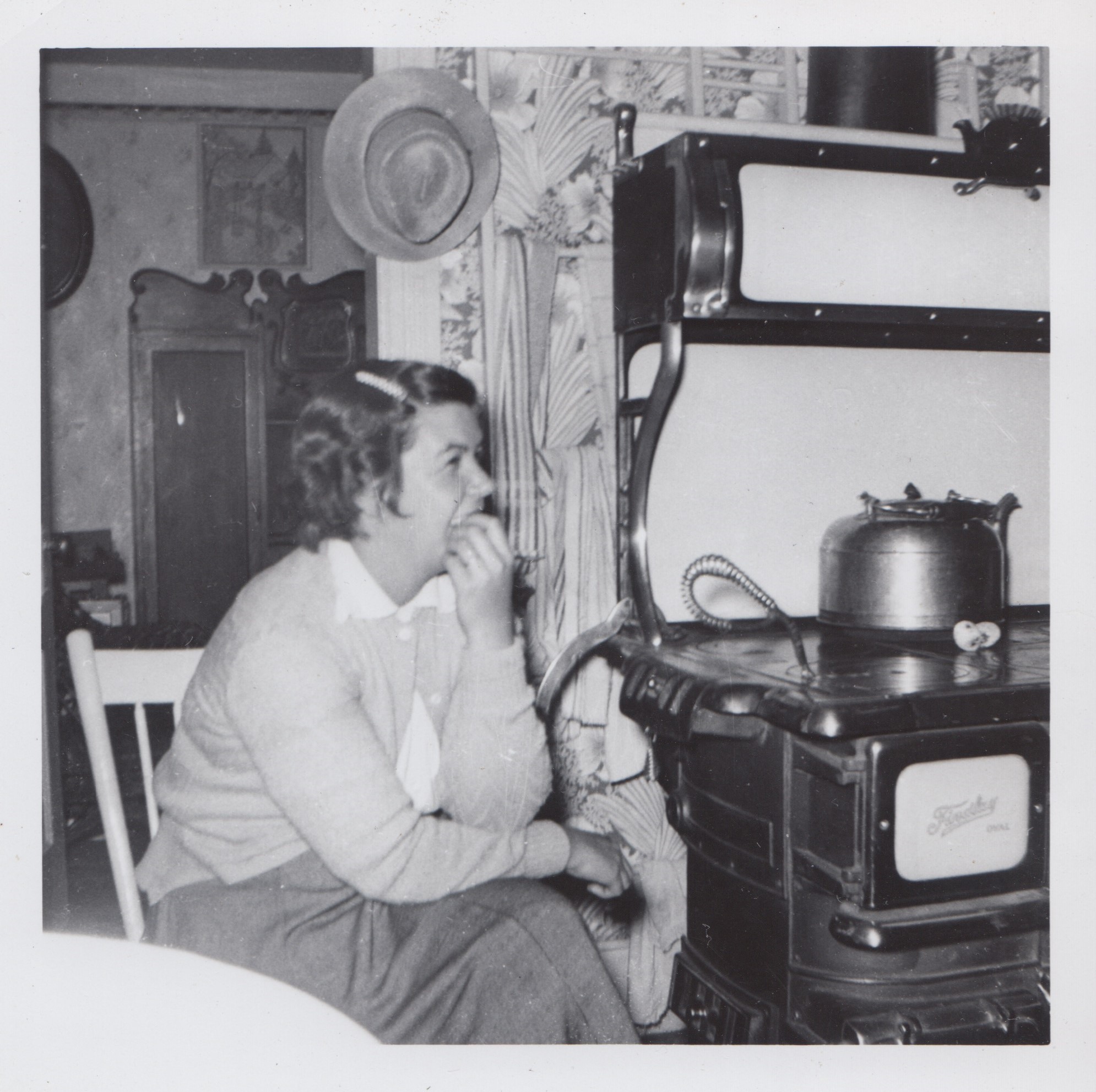 Black and white photo of Isobel Scott taken inside a home. Isobel is seated on a wooden chair wearing a cardigan with a barrette in her hair, beside an antique style stove. Floral wallpaper is visible on the walls behind her with a man's hat hanging on the door frame. No date given.