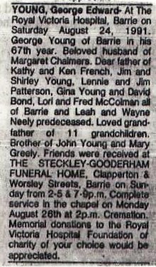 Newspaper obituary announcement for the death of George Edward Young obituary at the Royal Victoria Hospital on 24 August 1991 at the age of 67.