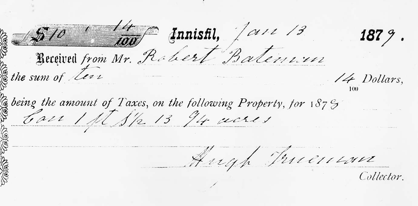 Receipt for Township of Innisfil taxes, $10.14, in 1879, for the farm of Robert Bateman, Mrs. Jack Constable's grandfather.