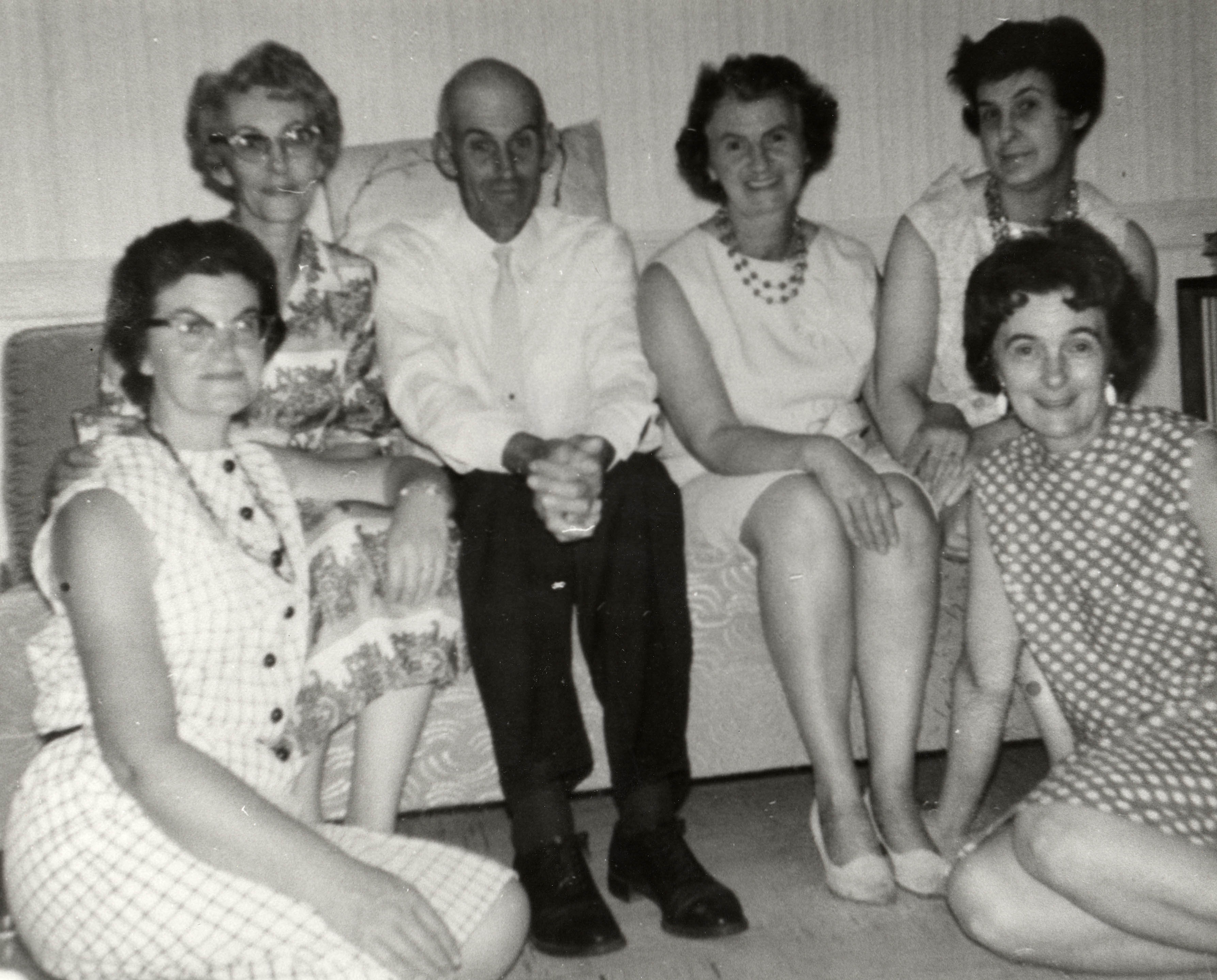 Image of Arthur and Florence Little's family, taken on Arthur's 90th birthday in 1967. The image is taken indoors, a man is sitting in the centre of a couch surrounded by women seated on the couch and floor. Pictured left to right: Edith (Married to Walter Jacklin of Elliot Lake); Grace (Married to Jack Morrow of Aurora); Bill (of Holly); Dorothy (Married to Norman Slack of Toronto); Mildred (Married to Glan Allen of Marlbank); Florence (Married to Wallace Kennedy of London).