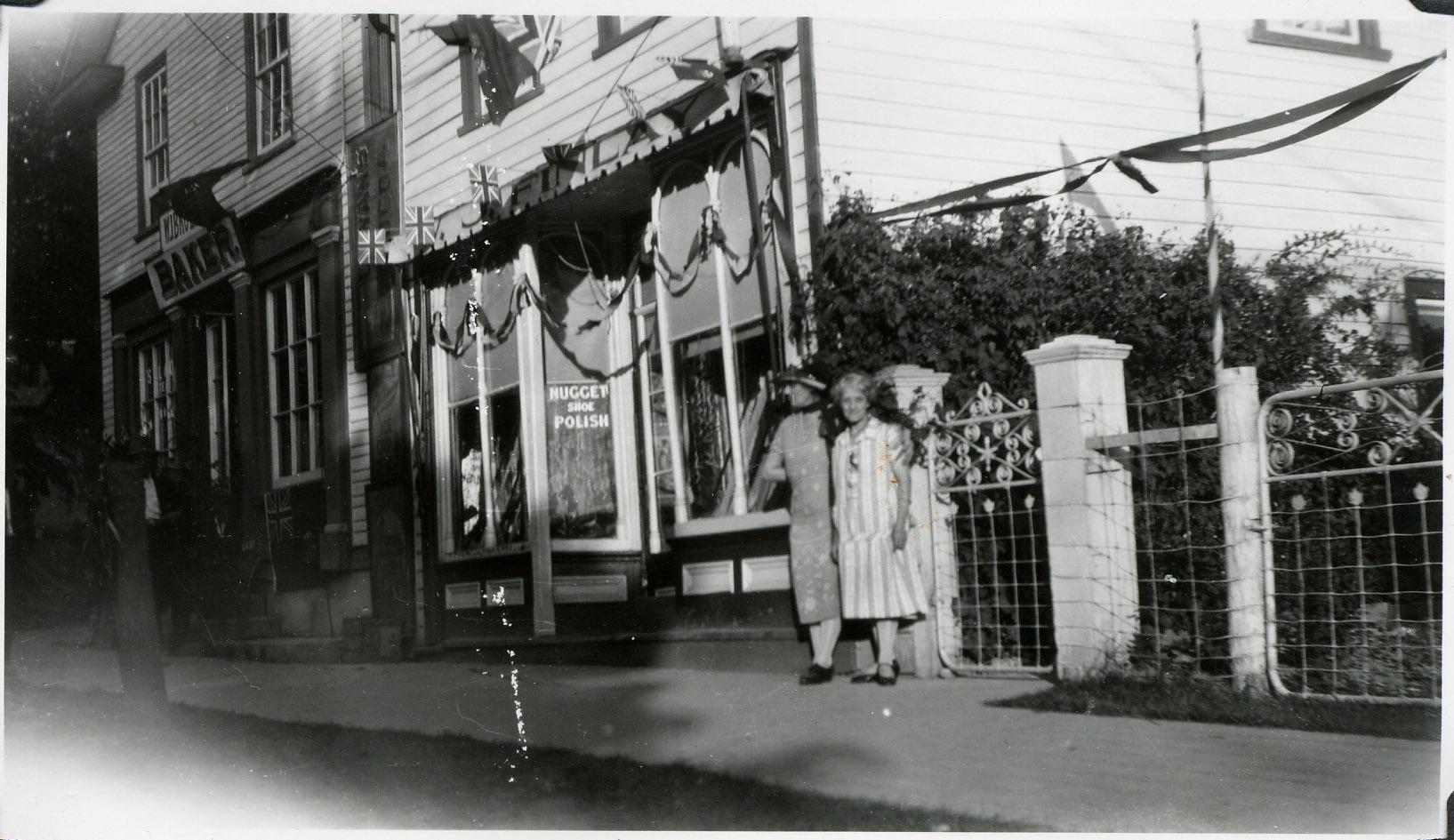 Mrs. Taylor and Miss Spence - Note the hitching post. Taken by Mr. Finley's show store and Broley's Bake shop.