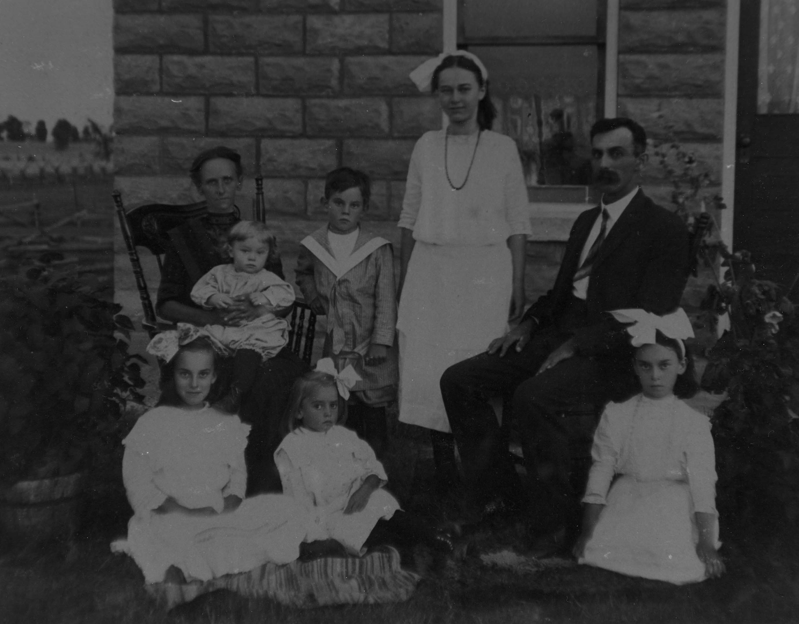 Group photo of the Jobbitt family featuring from left to right, back row: Mary (Birnie) Jobbitt, on her knee Raymond Jobbitt (2 years old), Bernard Jobbitt (7 years old), Marie Jobbitt (13 years old) and father Charles Jobbitt. Front row left to right: Freda Jobbitt (11 years old, died in 1977), Jean Jobbitt (5 years old), and Muriel Jobbitt (9 years old). Muriel would later marry Neville Jamieson. Annella Marie Jobbitt, known as Marie, married Cecil Irwin, but passed away after shortly childbirth. Bernard married Bertha Quinn, and Raymond married Alma Mary Robinson. Freda married Bert Peddie, and Jean first married William Gilroy, and later Herbert Carson.