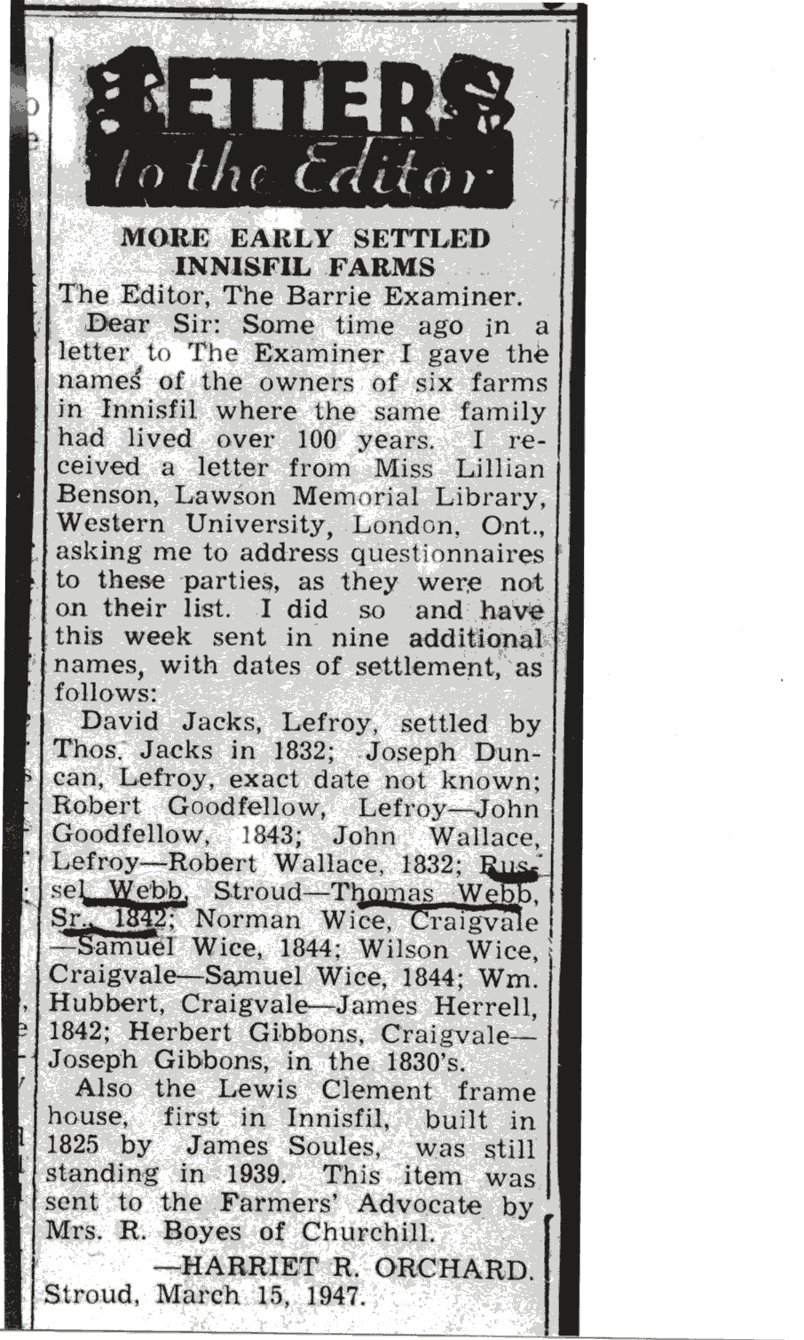 Newspaper Cutting - Letter to the Editor regarding Early Farm Settlers, One settler was Russel Webb, Stroud,- Thomas Webb Sr. - settled on farm -SH Lot 23. Conc. 13 in 1842