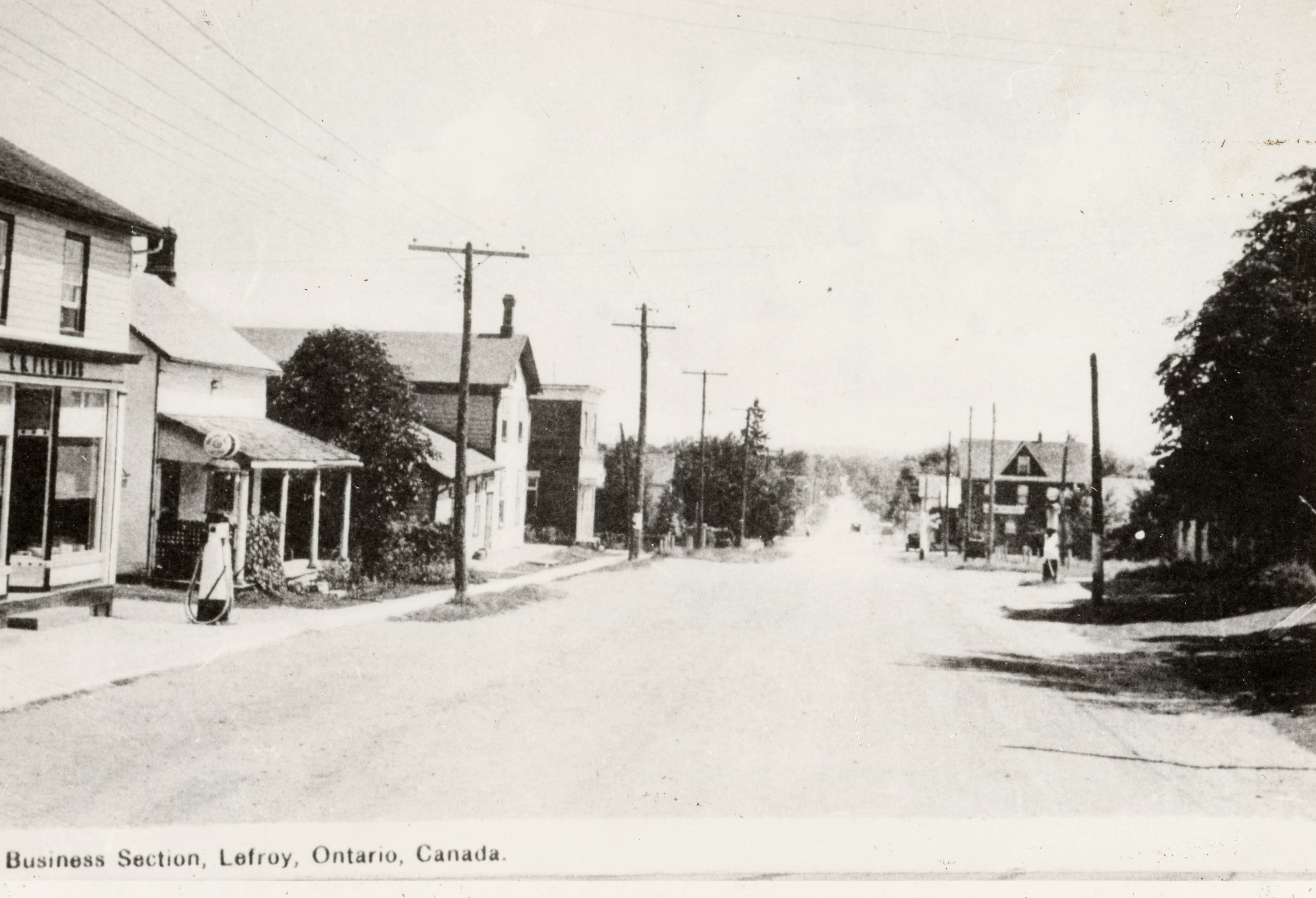 Post Card - Business section , Lefroy -- looking east when Ira Flemming kept store at left OHS and 474