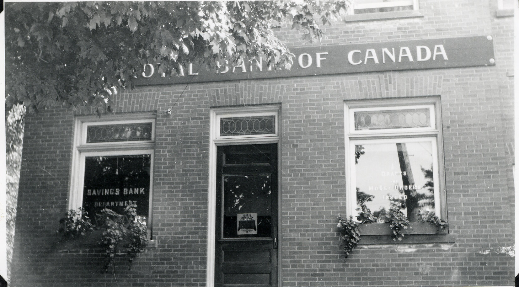 Photo of the exterior of the Royal Bank of Canada, Cookstown branch in 1968. The image shows the brick building's front door, flanked by a window on both sides, and a sign with "Royal Bank of Canada" above them. The window left of the door says "Savings Bank Department" and the window on the right reads "Drafts and Money Orders Issued." There is a small portion of patterned and stained glass above both windows and the door. The bank building was originally owned by G.T. Somers, but soon became a Sterling Bank. In 1905 Sterling Bank amalgamated with the Union Bank of Canada, which in turn was taken over by the Royal Bank of Canada in 1925.