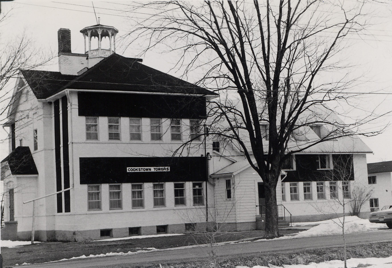 Photo of the exterior of the Cookstown Towers. Formerly the Cookstown School, the building was converted into apartments. It is a long white two storey building with black trim and roof, and two rows of rectangular windows. The photo was taken in the spring as there is a small amount of snow visible. If you have more information about the Coosktown Towers, please "suggest a correction" or contact the library at 705-431-7410.