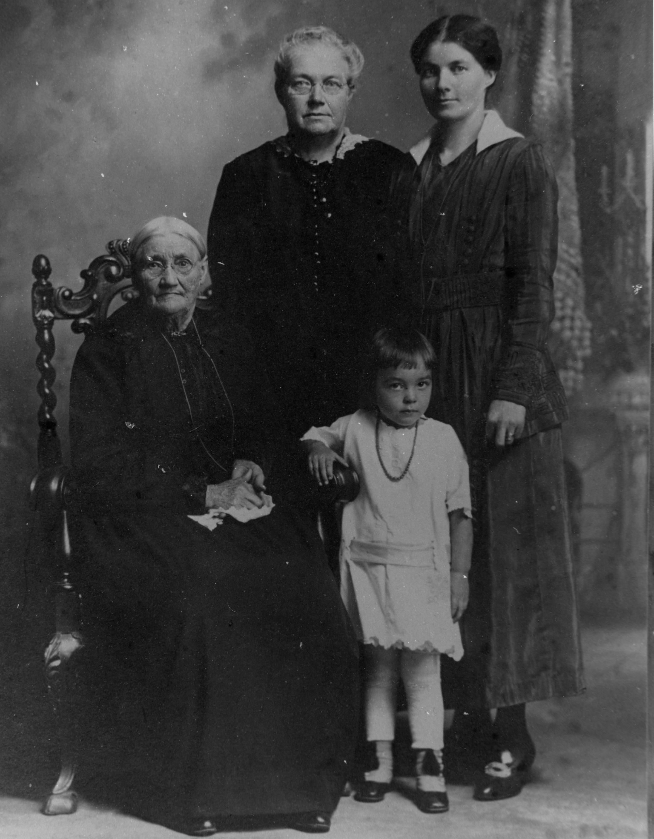 (Sitting): Mrs. Thomas McCullough (1837-1925) (nee Elizabeth Sawyer) (Standing): Mrs. Robert Stewart (1858-1931) (nee Monica McCullough), Mabel Stewart, Mrs. Hugh Donnelly (1889-1952), Luella Donnelly