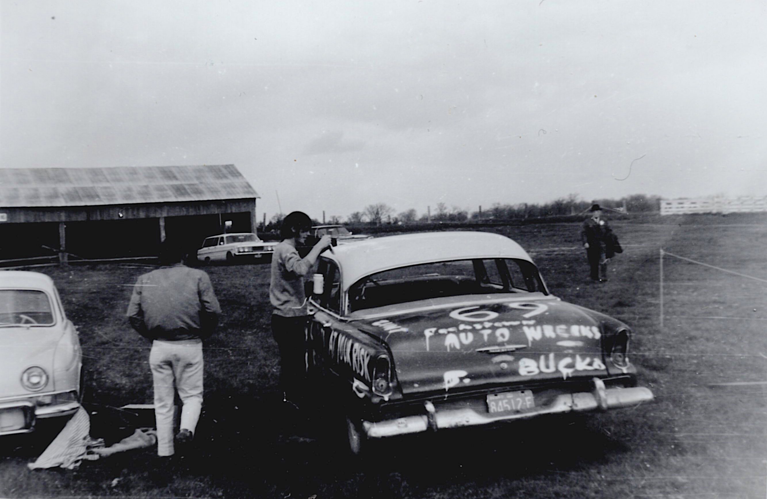 Photo of Danny Campbell and Paul Trotter preparing a car for a wrecking contest, most likely as a part of the Cookstown Fair in Fall 1967. The trunk of the car has been spray-painted with the number 69 and the words "Cookstown Auto Wrecks J. Bucko" - The name J. Bucko likely refers to John Bucko of Cookstown Auto Centre. A long shed and two other vehicles are visible in the background, as well as a white car to the left of #69. A man in a coat and dark hat is approaching the car from a field to the right.