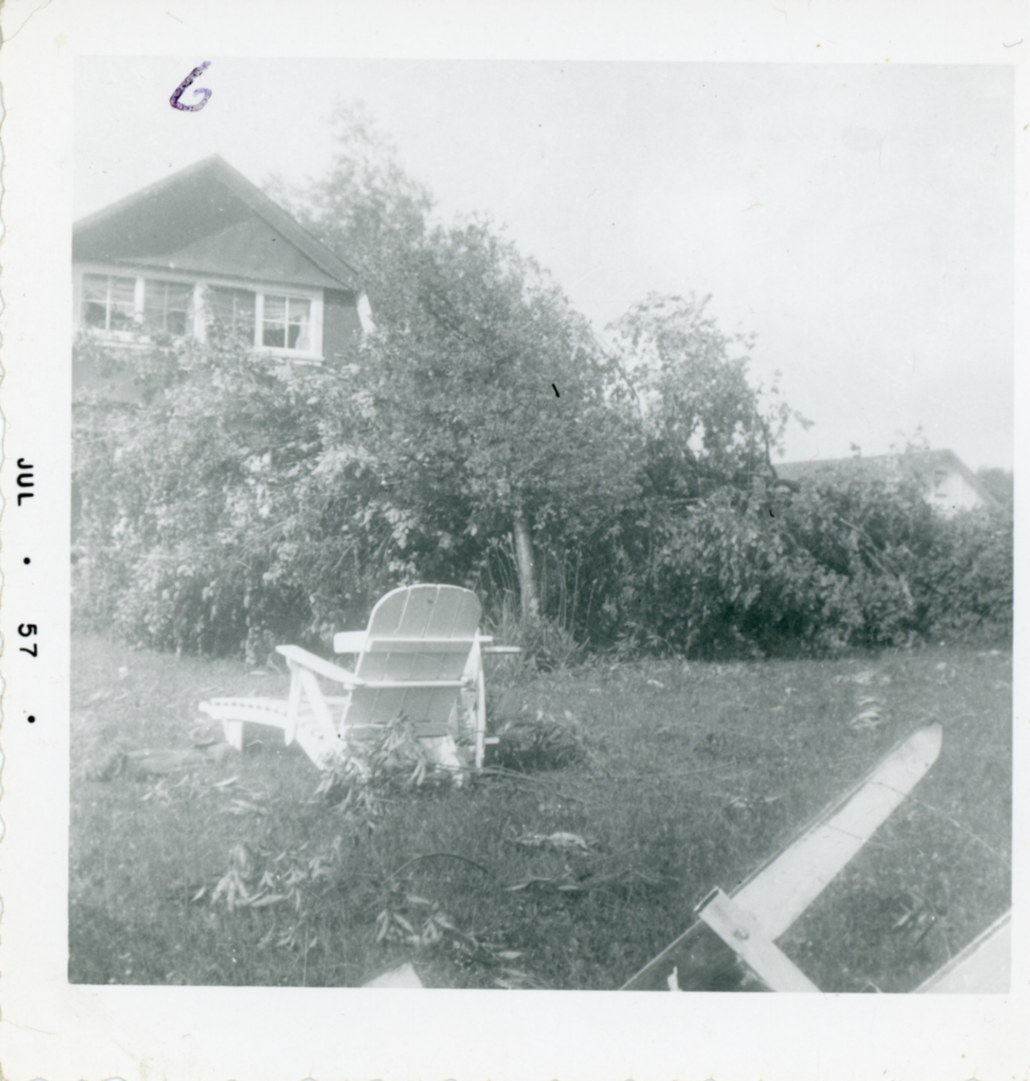 Image showing broken branches and fallen tree on front lawn of Wayne Haven Cottage in Belle Ewart, which was the family cottage of Tom, Dorothy, and Wayne Murray (cottage burned in 1959). This fallen tree was righted once branches were cut off. On July 3, 1957 a storm that could have been a mini tornado struck the area of Belle Ewart. It was mentioned on the radio at the time that the bulk of the storm occurred between 4:00 and 6:00 pm. The ground was saturated from rain the last two weeks of June 1957. Heavy wind did a great deal of damage. In the back ground of this photo is the Murray Family cottage "Wayne Haven". In the foreground are the upturned roots of an elm tree that was felled during the storm. According to the Murray family, roofs blew off, rowboats were blown into trees, neighbouring cottages of the Grossman Family had all their screens blown out and a garage was blown over. With no phone lines the people of the area lined up at Wark's Store to call fathers and husbands who had returned to work in Toronto. Due to the rain the water level of Lake Simcoe rose so high that it flowed over the break wall, covering lawns and roads.