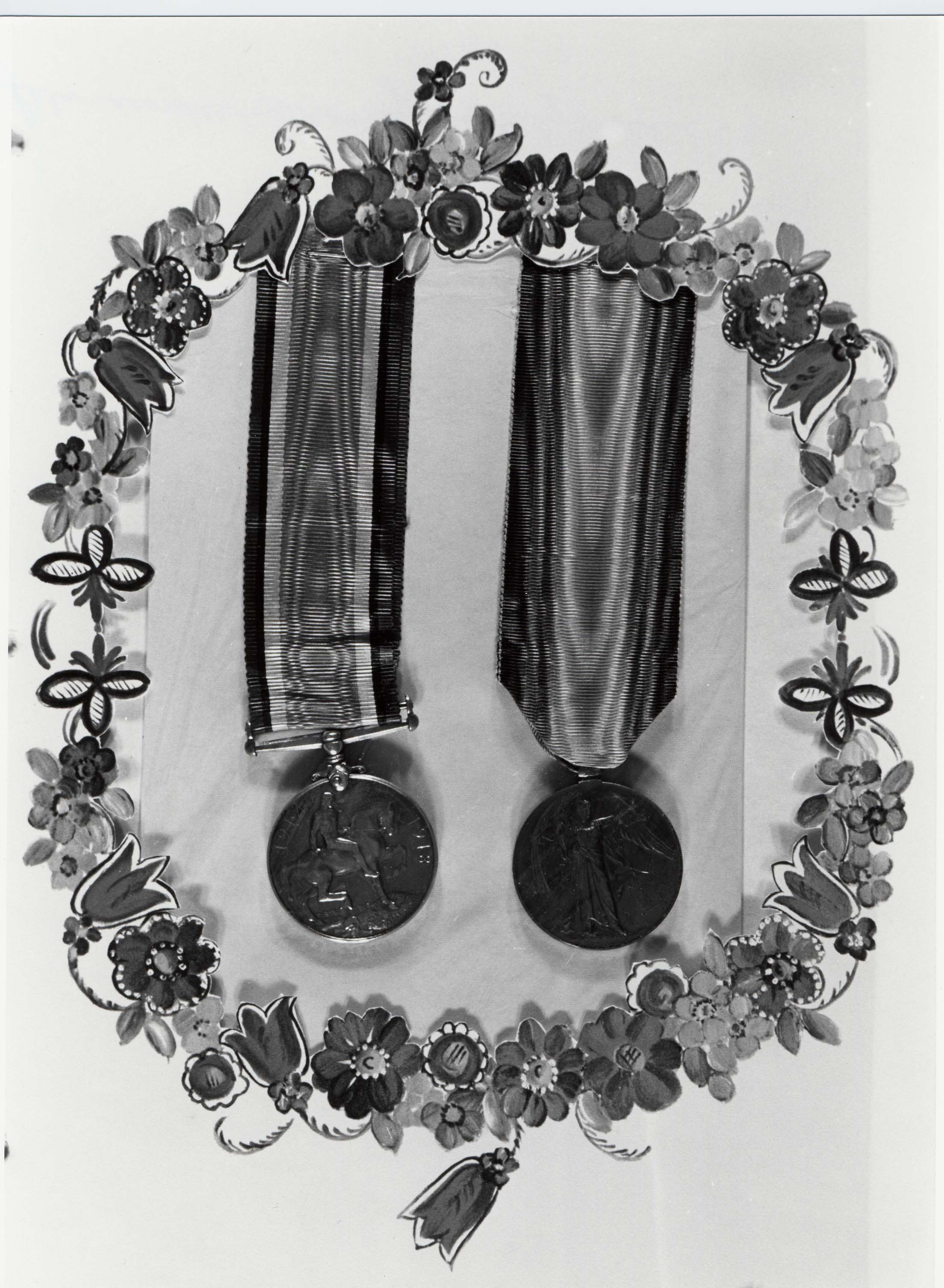 Photograph of the two war medals belonging to Edward Harold Irving of Stroud during the First World War. The medal on the left depicts a man mounted on a horse known as the British War Medal, while the one on the right depicts a robed figure with wings known as the British Victory Medal.
