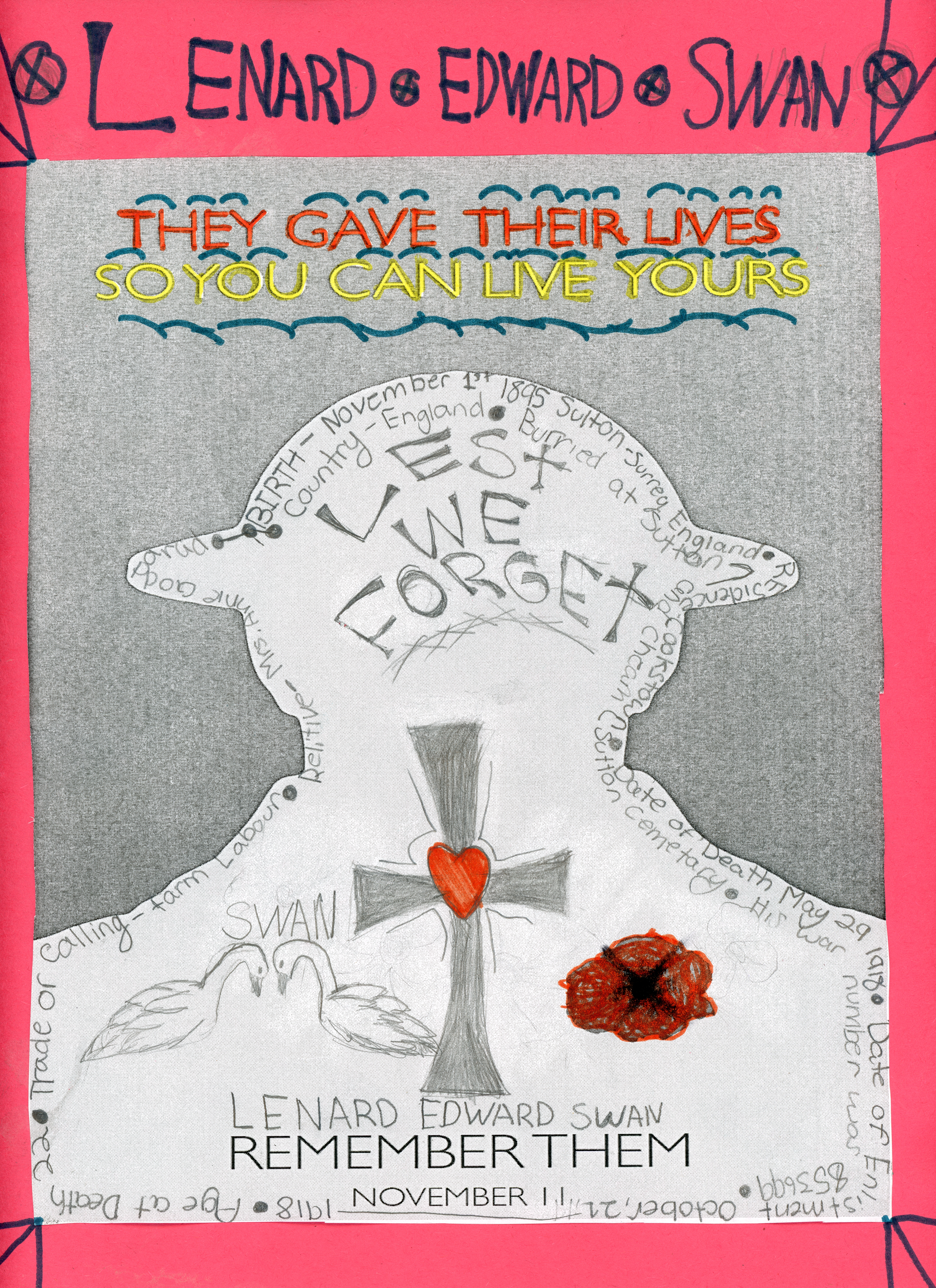 In the fall of 2015 the Grade 8 class at Alcona Glen Public school embarked on an inquiry project designed to further the class’s investigative skills while honouring the lives and memories of local Veterans. Within Walking distance of Alcona Glen there are 25 streets named for WWI & II Veterans. Students researched the lives of the veterans and summarized them, attaching them to a map of the community. This project honours Alfred Edward Swan (the text on the image labelling the soldier as Leonard Edward Swan is incorrect). Swan was born November 1, 1895 in Sutton, Surrey, England. He lived and farmed in Cookstown, Ontario before enlisting in the 177th Overseas Battalion, Canadian Expeditionary Force (Service Number: 853699) on October 21, 1916. Swan died on May 29, 1918 at age 22 of pneumonia. He was serving with the 4th Battalion when he died at the Suffolk Hospital, Ipswich, England, on May 29, 1918. He is interred at Sutton and Cheam Cemetery, Surrey, England. From Innisfil Veterans: Their Lives and Memories, page 48.