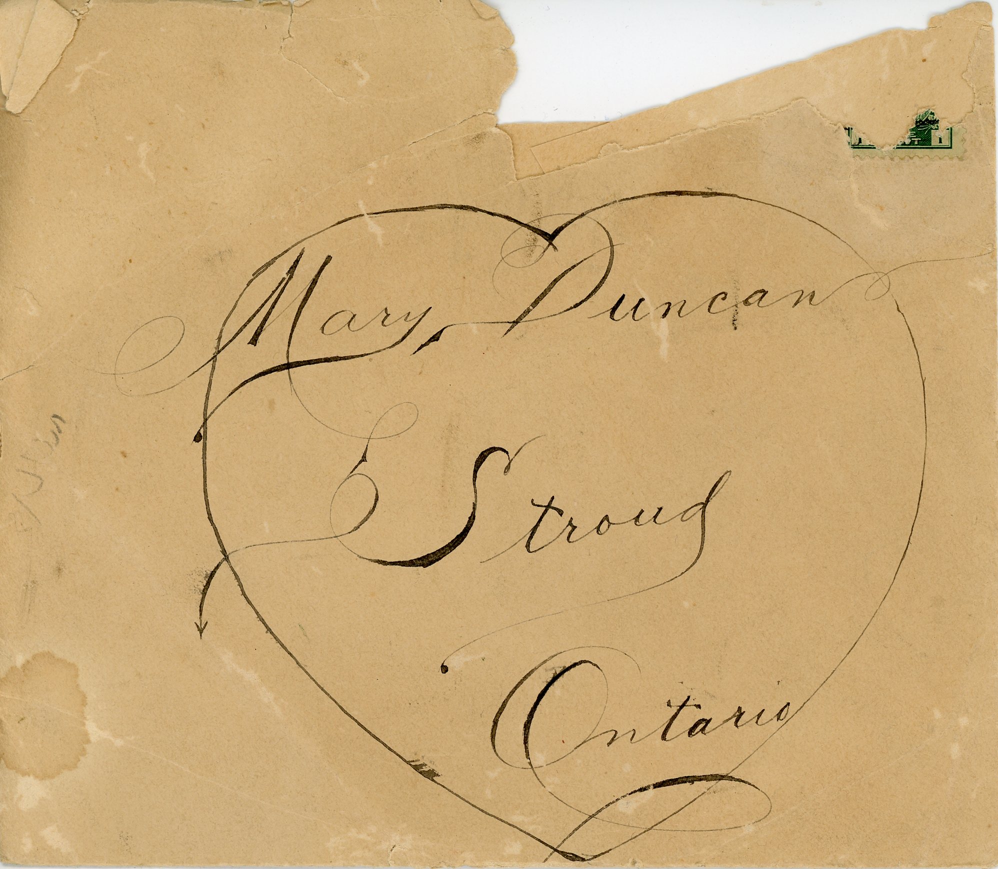 A brown envelope with the words "Mary Duncan Stroud Ontario" handwritten inside a drawn heart on the front. The stamp is now mostly missing, but the envelope is a good example of how mail previously did not require specific addresses or postal codes to be