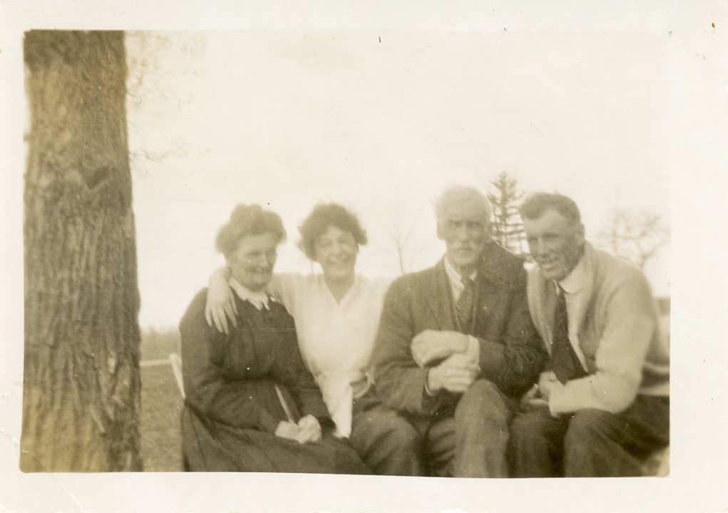 Photo of the Barclay family seated outside for a photo beside a large tree. From left to right are: Maria Louisa Barclay (née Nixon), Margaret Barclay, John Barclay, and David "Dee" John Carlyle Barclay. Margaret and Dee were the children of Louisa and John.