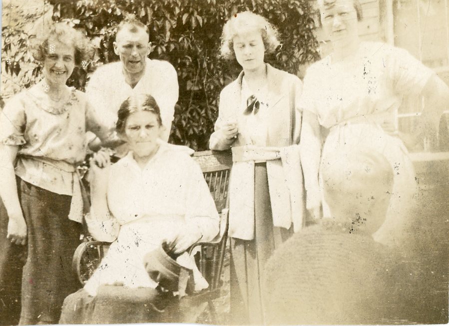 Photo of some of the members of the Barclay family gathered around their mother Maria Louisa Barclay, seated in the wooden chair. Also pictured from left to right are: unknown woman, Dee Barclay (behind the chair), Lucy (or Lucie) Nixon the daughter of Arthur Nixon, and Eleanor Elizabeth Zeta Barclay. The back of Jack Sharpe's head is also visible in the lower right corner of the photo.