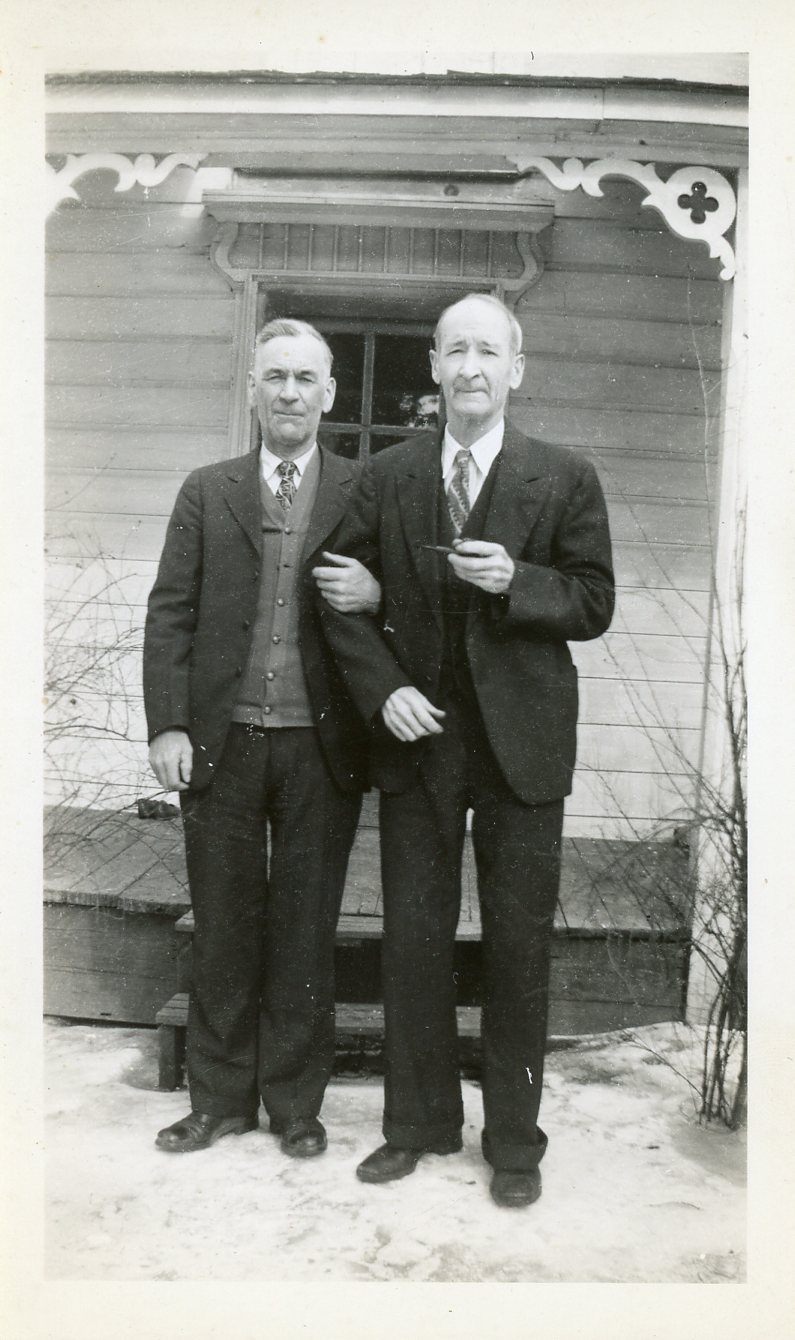 Photo of brothers Jack and Alexander Constable wearing dark coloured suits and posing in front of the porch of a house. Their arms are linked and Alexander is holding a tobacco pipe.