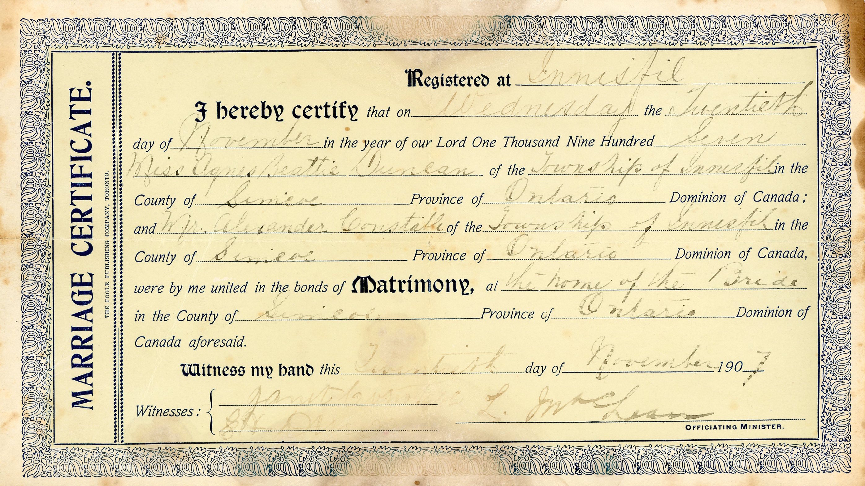 Scan of the marriage certificate for Agnes Beattie Duncan and Alexander Constable. The text reads: "Registered at Innisfil, I hereby certify that on Wednesday the Twentieth day of November in the year of oour Lord One Thousand Nine Hundred Seven Miss Agnes Beattie Duncan of the Township of Innisfil in the County of Simcoe Province of Ontario Dominion of Canada; and Mr. Alexander Constable of the Township of Innisfil in the County of Simcoe Province of Ontario Dominion of Canada, were by me united in the bonds of Matrimony, at the home of the Bride in the County of Simcoe Province of Ontario Dominion of Canada afroresaid. Witness my hand this Twentieth day of November 1907" the document also contains the signatures of two witnesses, the top signature belonging to Janet Constable and the lower signature is illegible. The officiating minister was L. McLean.