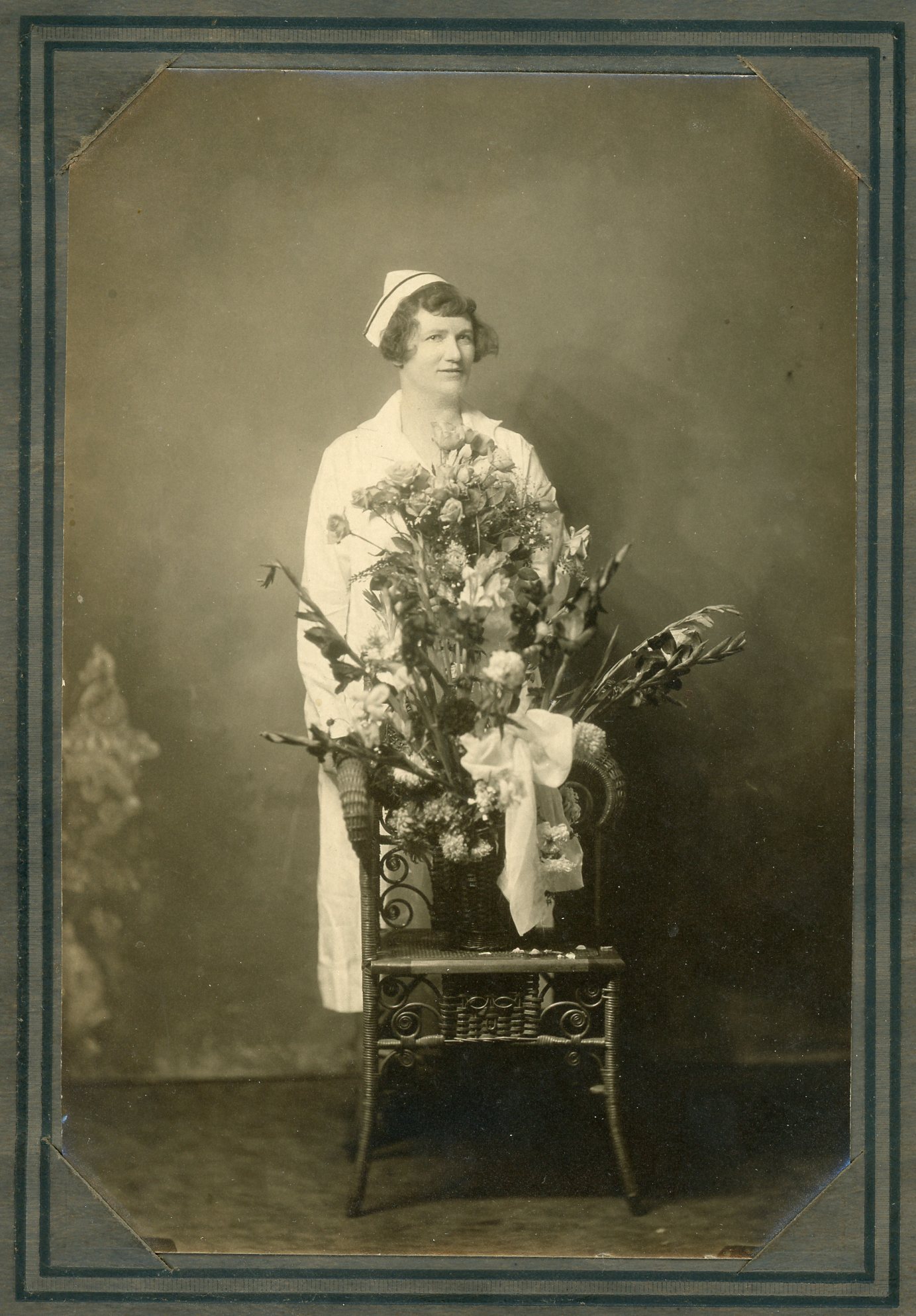 Graduation Portrait of Eleanor Elizabeth Zeta Barclay, known as Zeta. She is pictured standing in front of a large bouquet placed on a wicker chair, and is wearing a nursing uniform, including a nurse's cap. She was a graduate of Stone Memorial Hospital in Parry Sound. A large bouquet is also in front of Zeta on the floor. She was the daughter of John Barclay and Maria Louisa Barclay (née Nixon), and was married to John Parker and Telford Wright Sharpe. She had two children: Evelyn Arloah Sharpe and Jack Telford Denis Sharpe. Much of her nursing career took place in New York City.