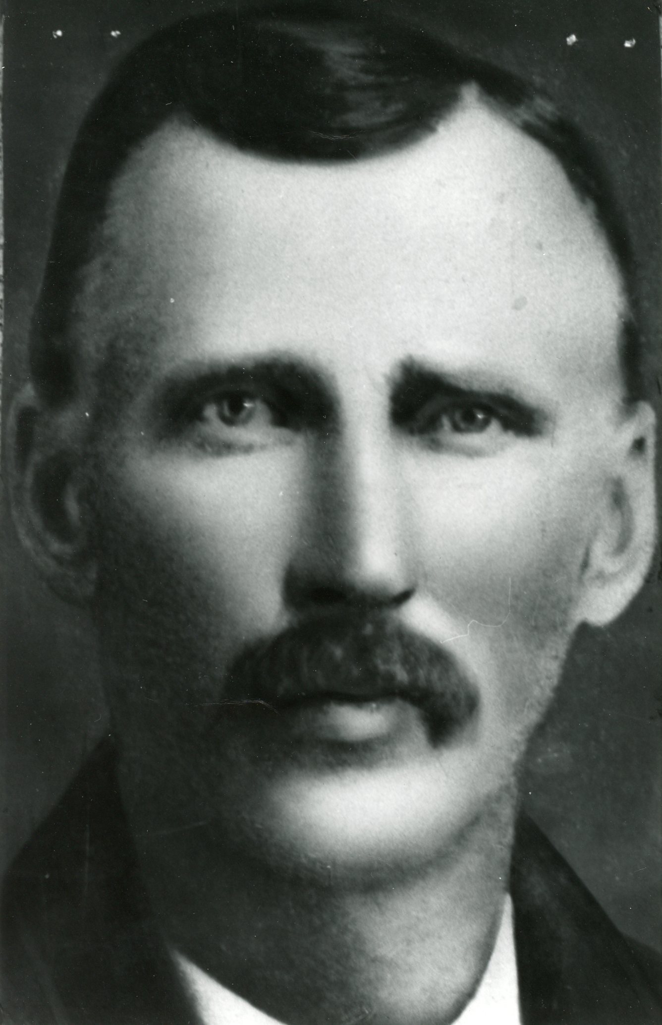 Portrait of John Barclay sporting a moustache as an early to middle aged man. The collar of his shirt and jacket are just visible at the bottom of the photo.